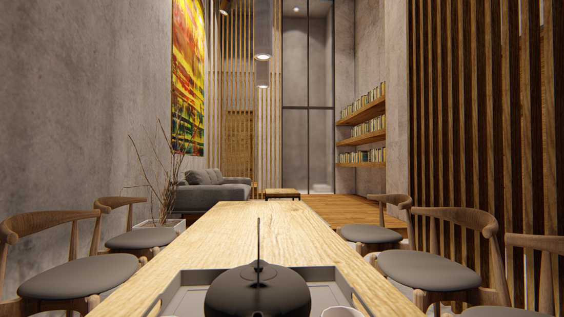 VIP洽谈室可以进行私人办公、开会、洽谈与会友等活动,木质地板,布艺沙发营造比较舒适轻松的室内氛围,用一个小高差划分饮茶区和洽谈区。