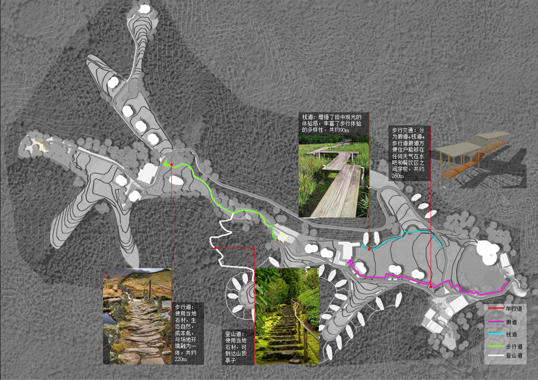 步行交通:由于谷底形态狭长,为了尽可能多的保留谷中田地景观,因此步行交通类型有铺装步行道、廊道、栈道、登山步道等。
