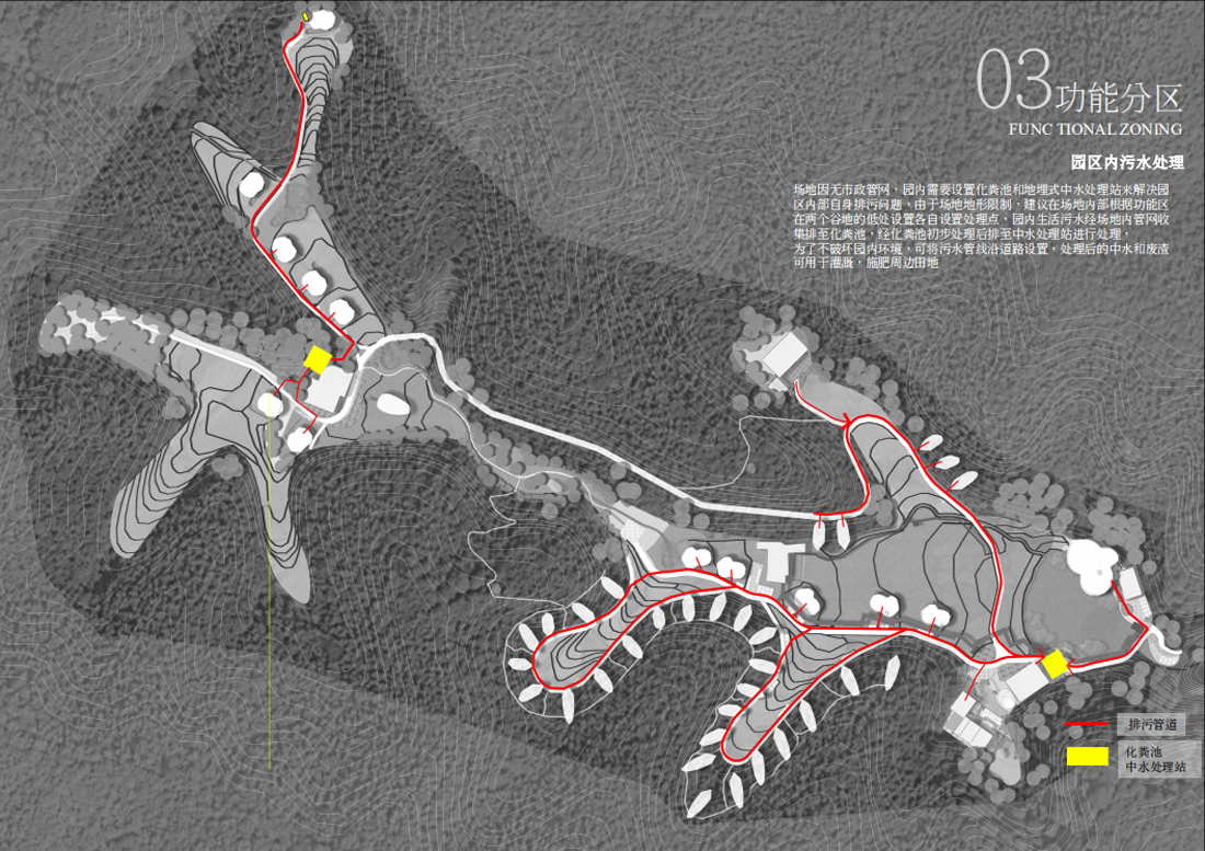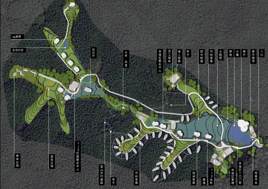 通过对项目场地的勘察分析,WAQI把整个项目场地分为四大区域:入口区、住宿区、休闲区以及VIP服务区。
