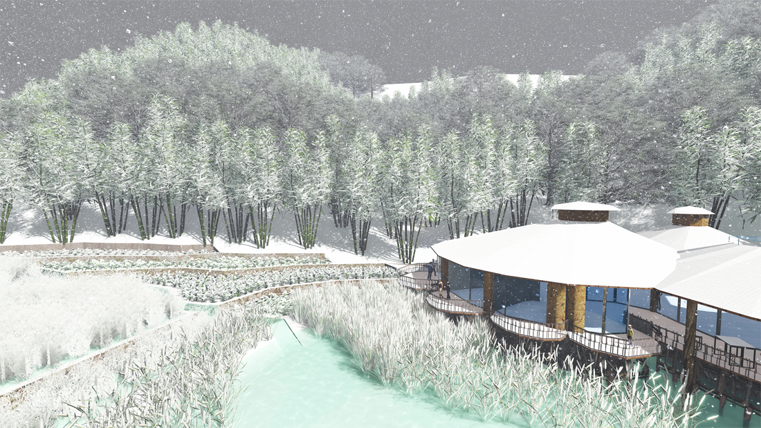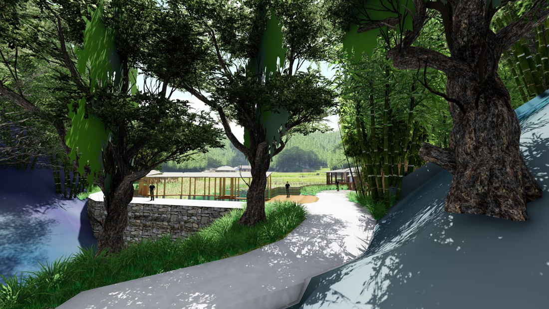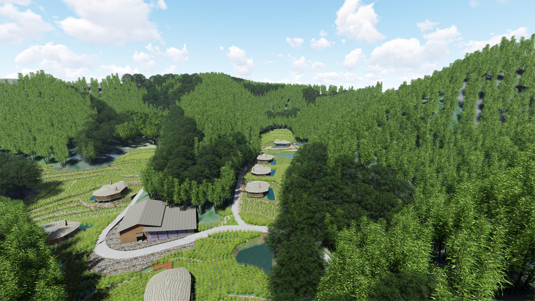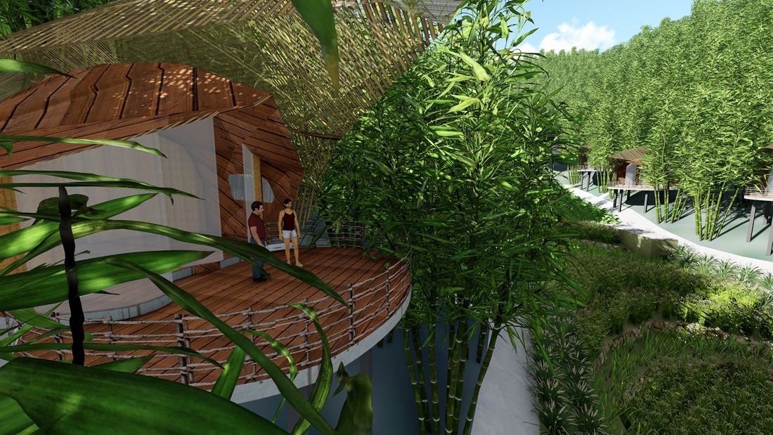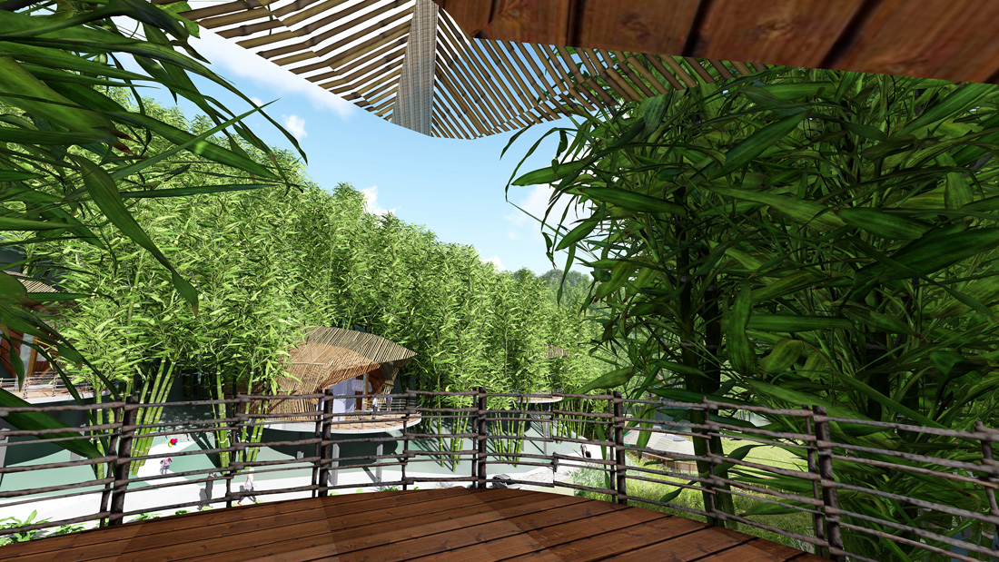 林间住宿区处于竹林处,建筑以竹子做外皮,隐藏于林间处;