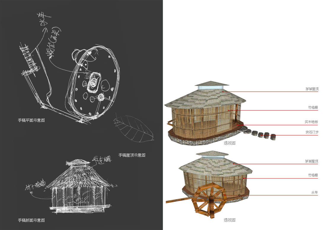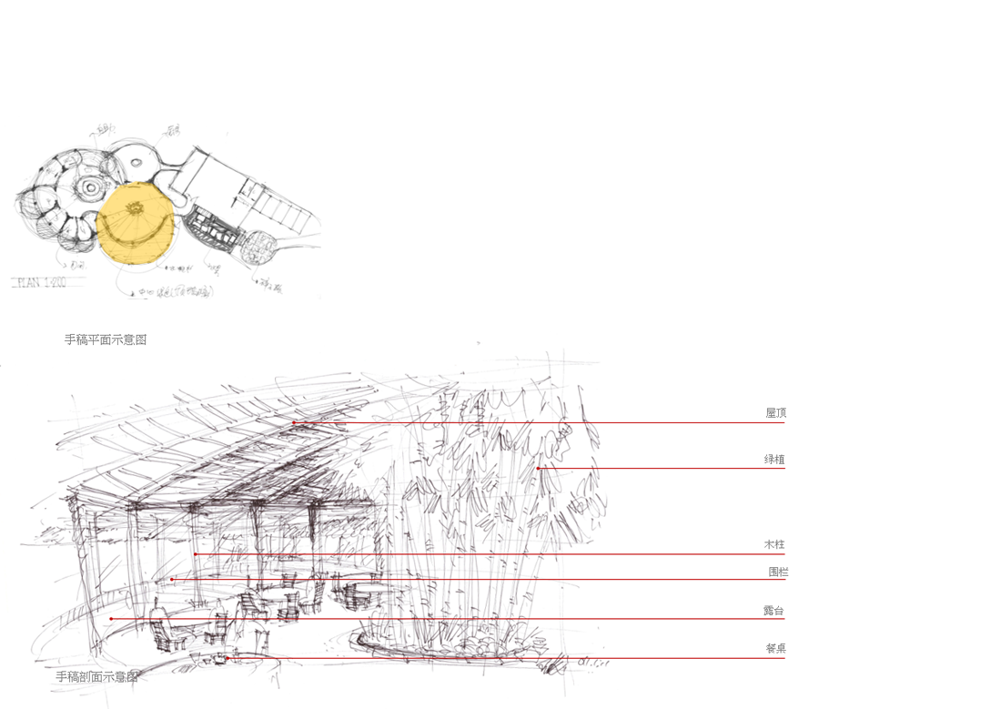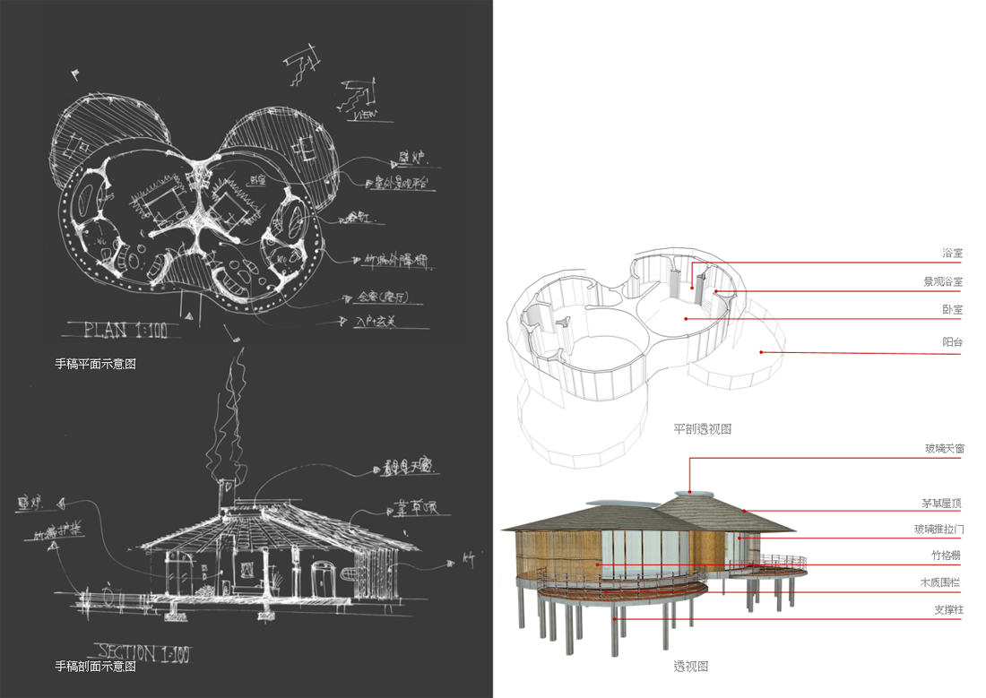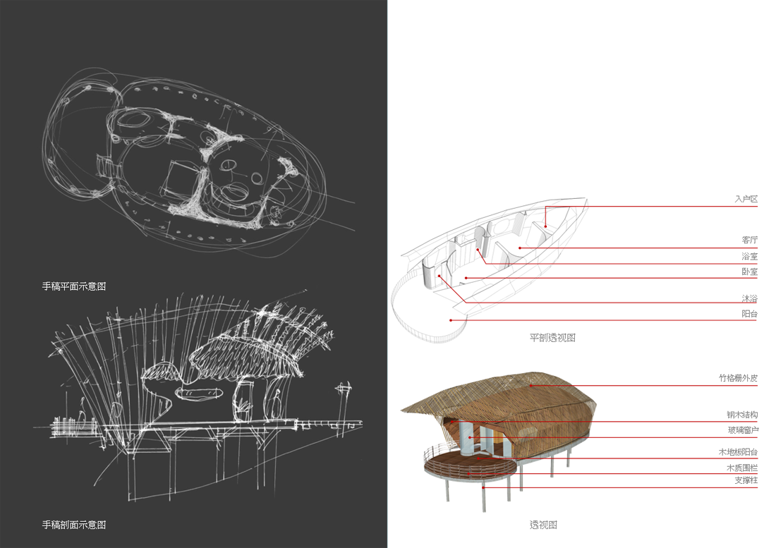 林间住宿区处于竹林处,建筑以竹子做外皮,隐藏于林间处;