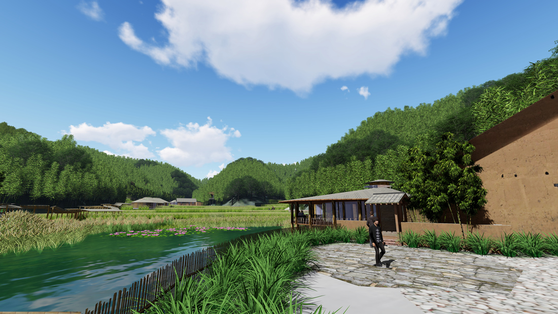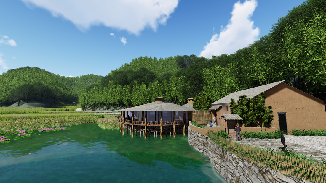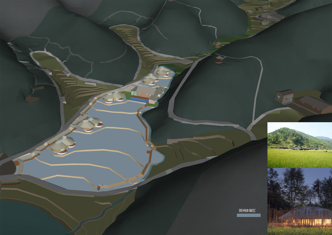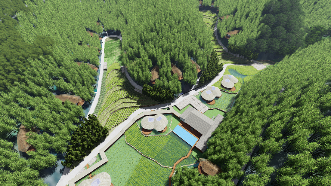 会所区将旧房改造成三套VIP住宿,中间增加公共茶室,方便住户在此饮茶休闲,东北侧设置一个泳池及休息亭作为此区域的附属功能,梯田台地可种菜种。