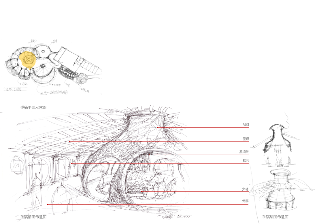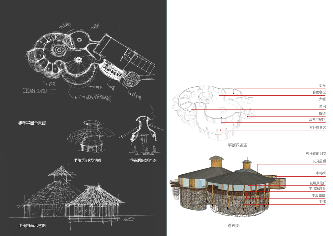 餐饮区建筑整体半悬挑于水面之上,室内由大堂区、包间区、自助用餐区、火塘区跟厨房五部分组成。水面上的外挑就餐区是非常好的观景区域,而室内的火塘可让用餐者有更多的交流空间,也可以为而处于最近的自助餐区域提供空间,包间区域都带有独立的阳台,增加观景视野。