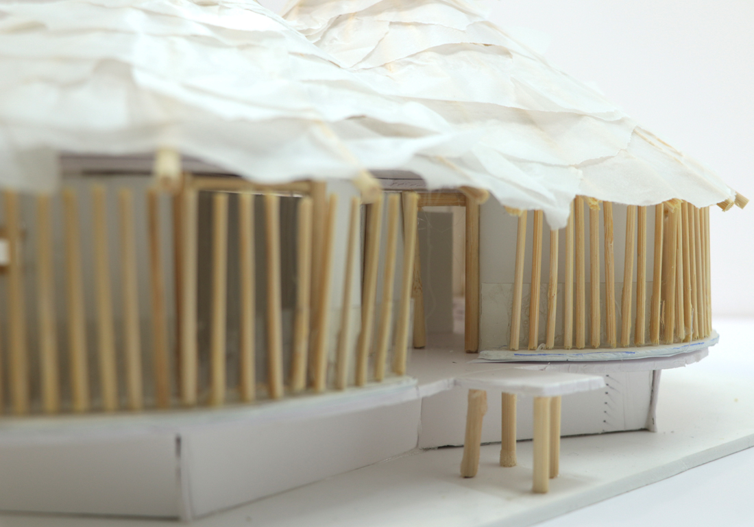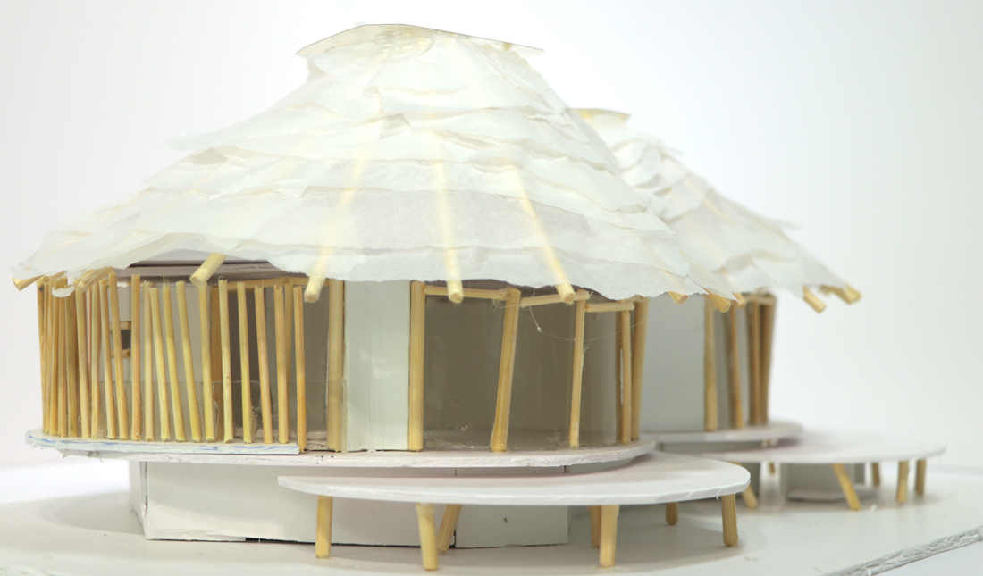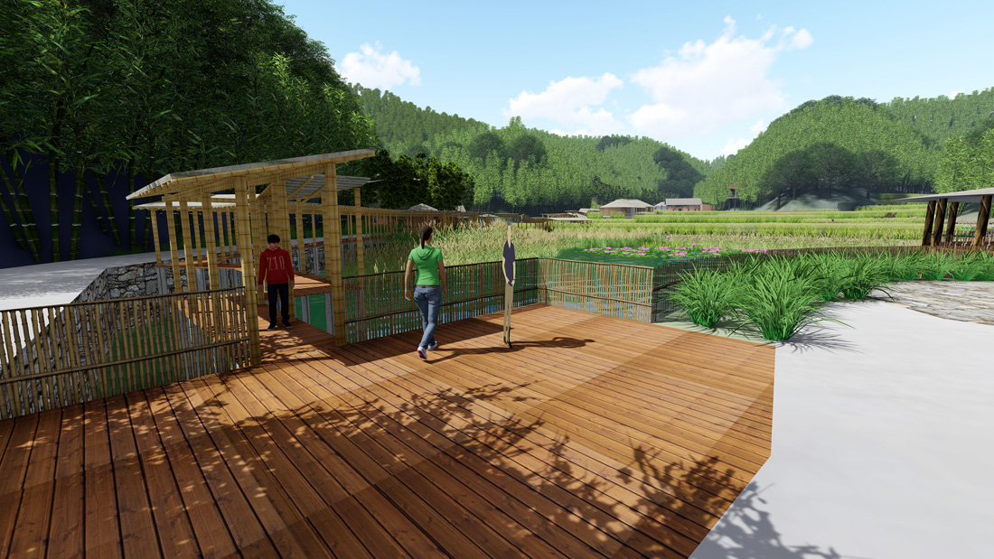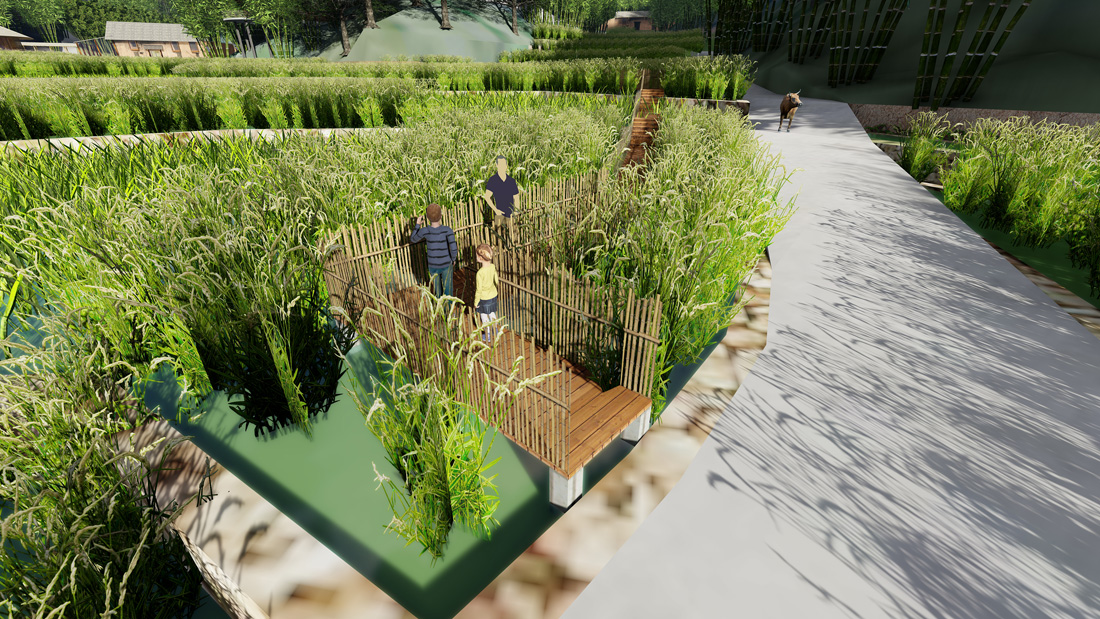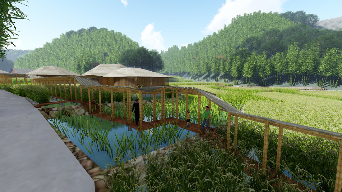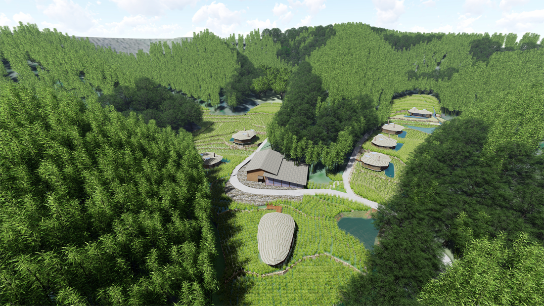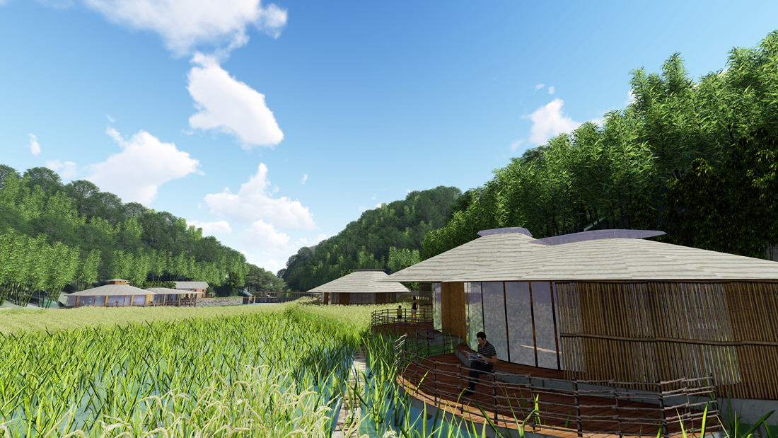 田间住宿区整体安置在轴心位置的稻田景观区域,使用茅草做屋顶,夯土墙饰面,用竹子做格栅,从而使建筑融合与自然景观中;