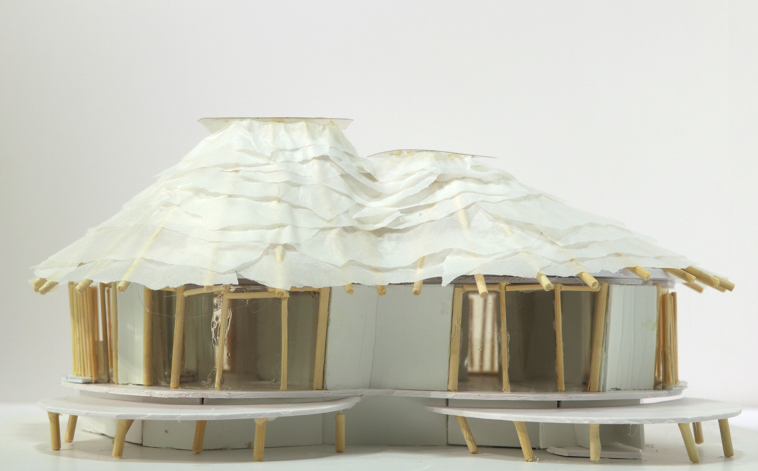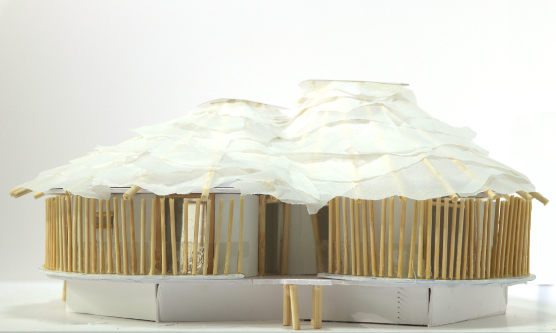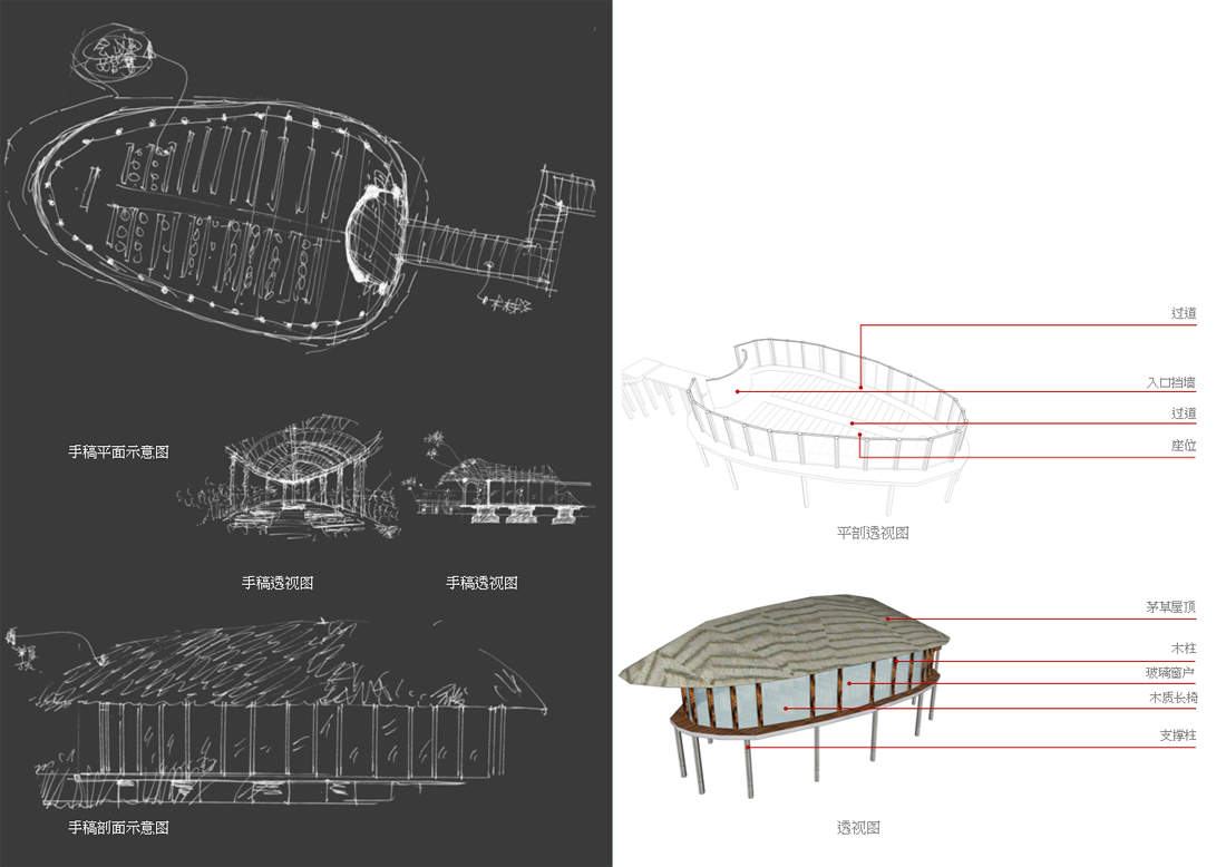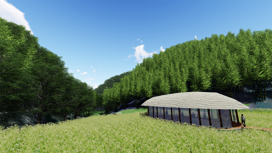 会议厅建筑整体立于稻田中,茅草做屋顶,建筑整体用玻璃围成打开观景视野面,并用木柱做支撑,远处观望疑似飘于稻田中的一片叶子。此建筑主要提供给园区开会使用。