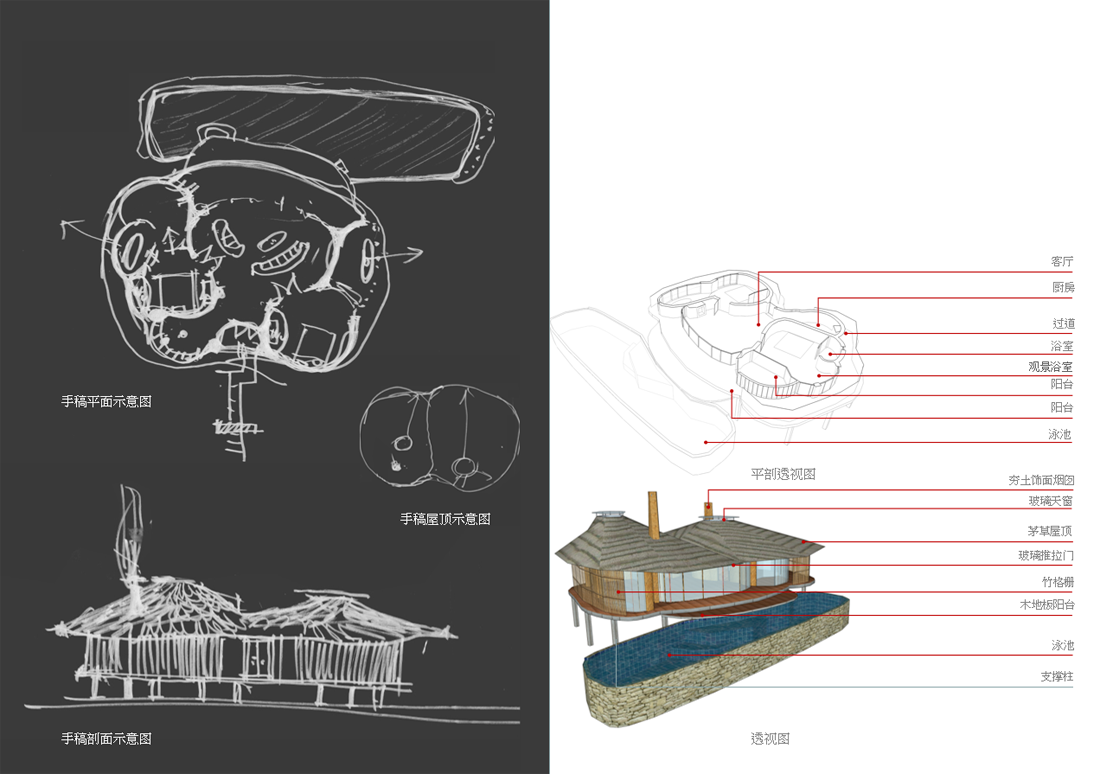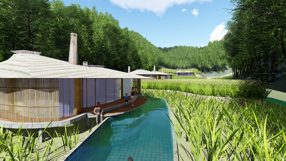 VIP区的建筑内包含两个卧室、两个浴室、两个观景浴室、一个厨房和一个客厅组成。曲面的使用让建筑更好的融与景观之中,室外的生态泳池区处于稻田之中,木质的地板,茅草屋顶跟夯土饰面墙让这个建筑跟具田园气息,而大量的玻璃推拉门使的建筑又有更好的景观视野。