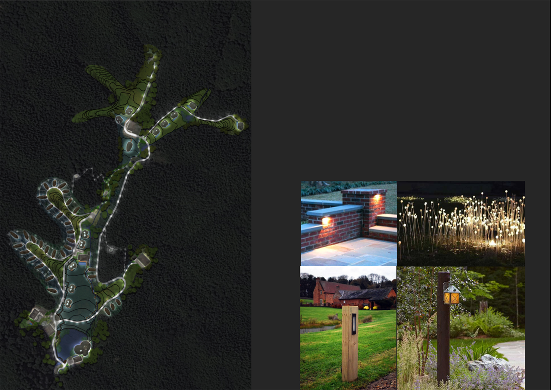 夜景以功能性照明为主,除路灯外,主要使用庭院灯,照树灯和LED灯(LOGO)。其中主干道主要使用庭院灯;步行道主要使用草坪灯;廊道、栈道主要使用射灯,灯光偏暖白色,营造温暖迷人的灯光氛围。