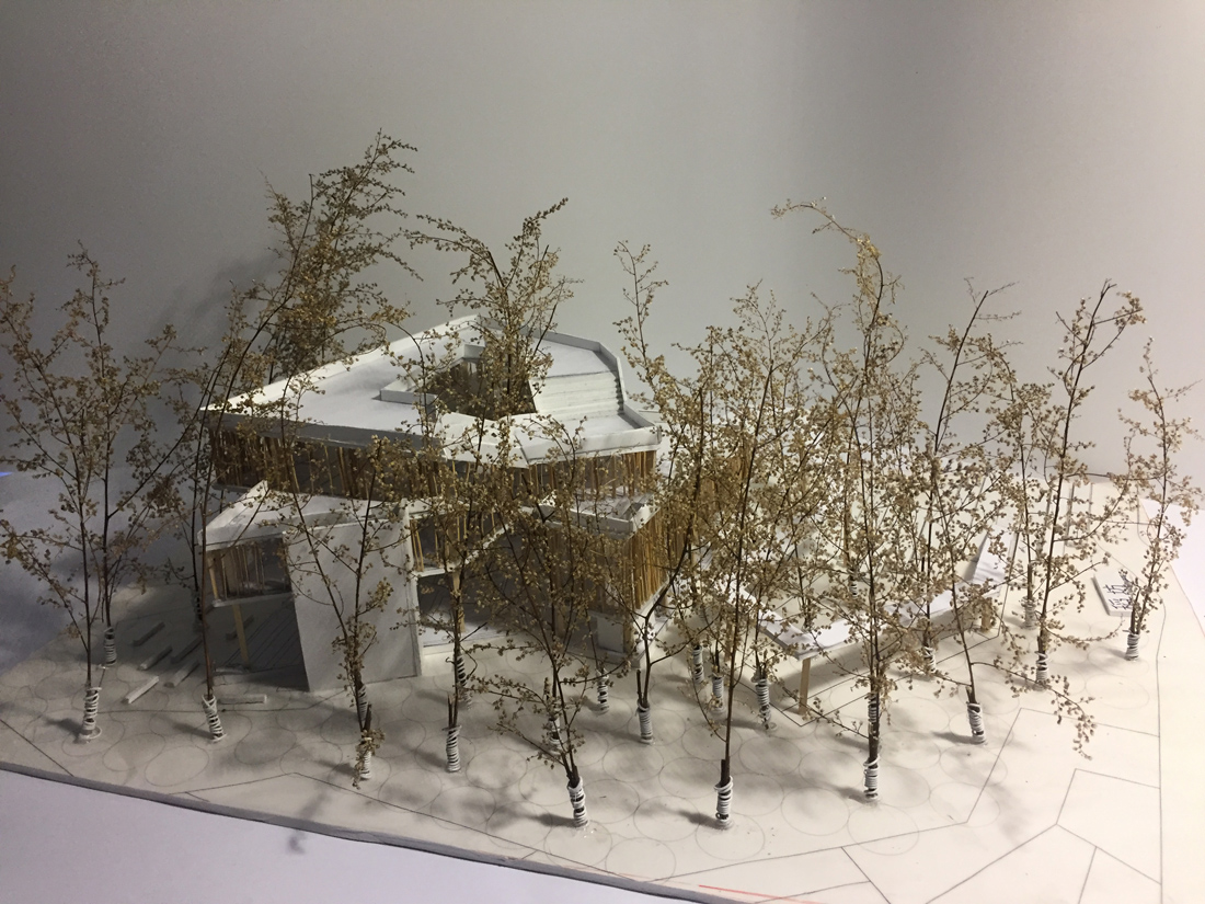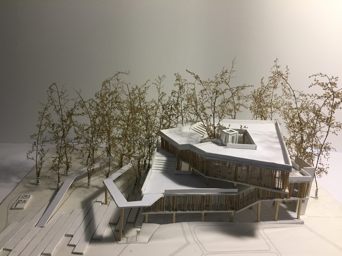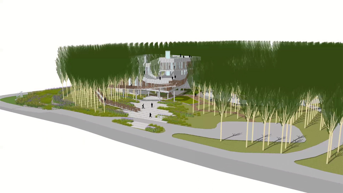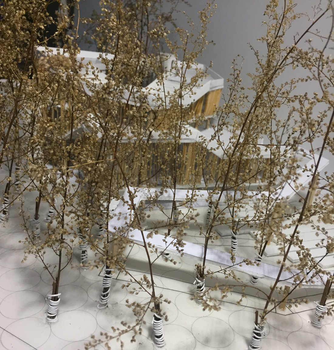 把建筑的中庭打开,结合场地内的杨树,打造庭院景观,让建筑的通风、采光更好。二层建筑交错相叠,将建筑局部抬高,使顶层有更开阔的视野。
