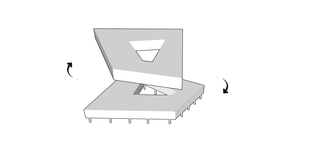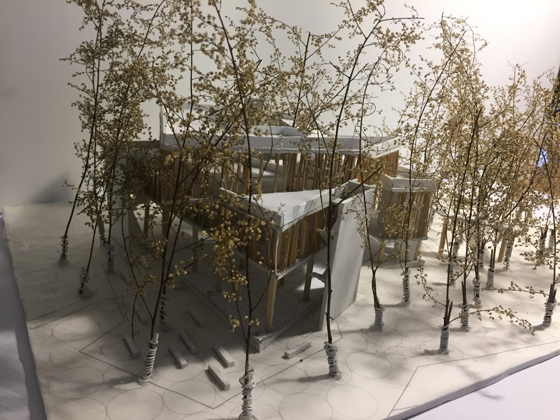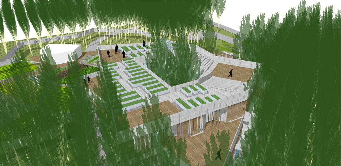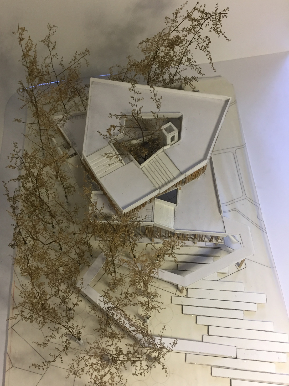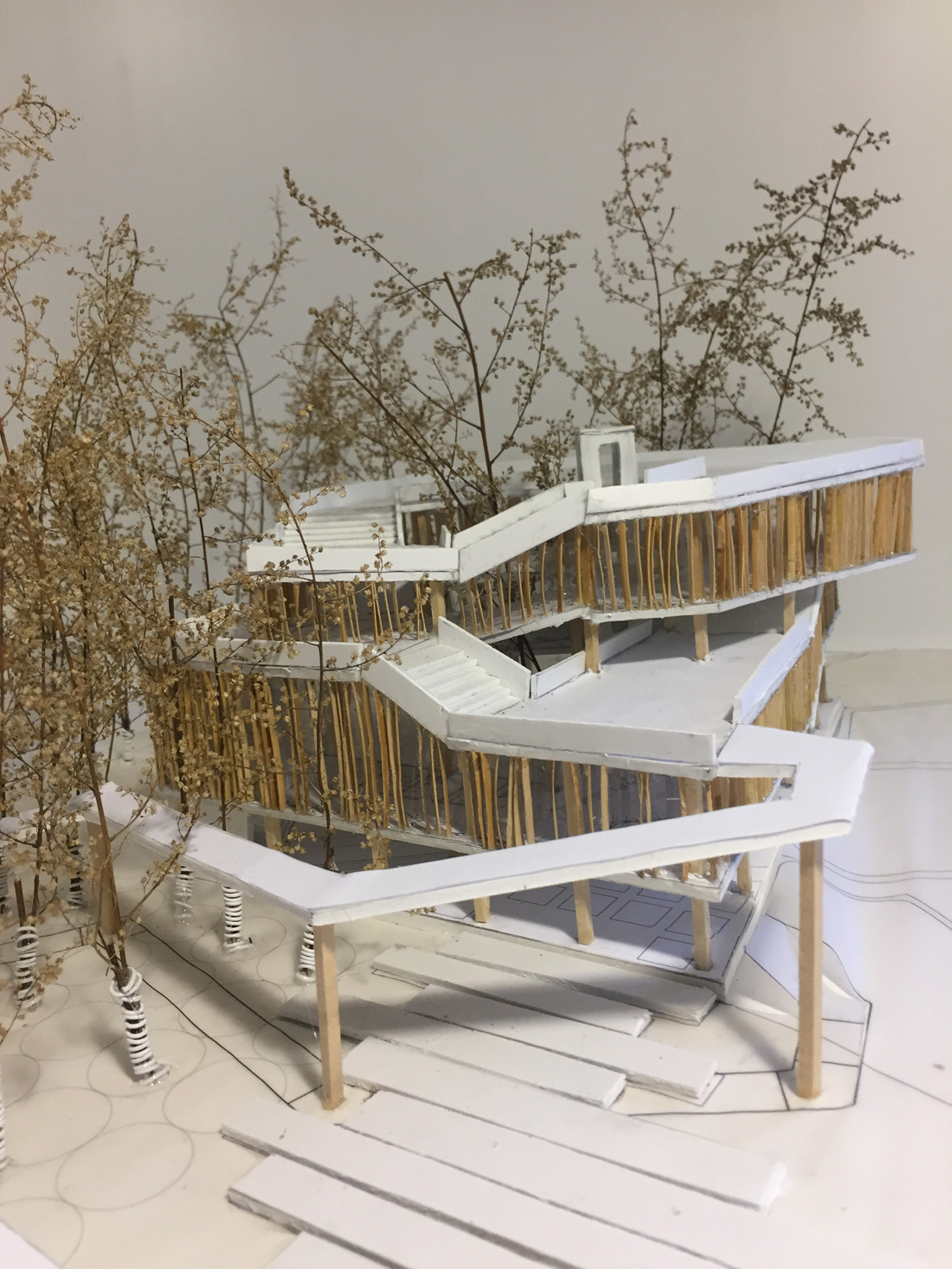 把建筑的中庭打开,结合场地内的杨树,打造庭院景观,让建筑的通风、采光更好。二层建筑交错相叠,将建筑局部抬高,使顶层有更开阔的视野。
