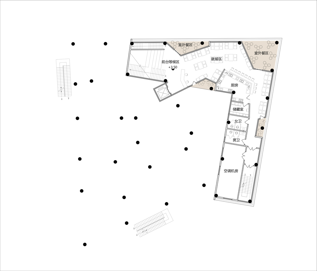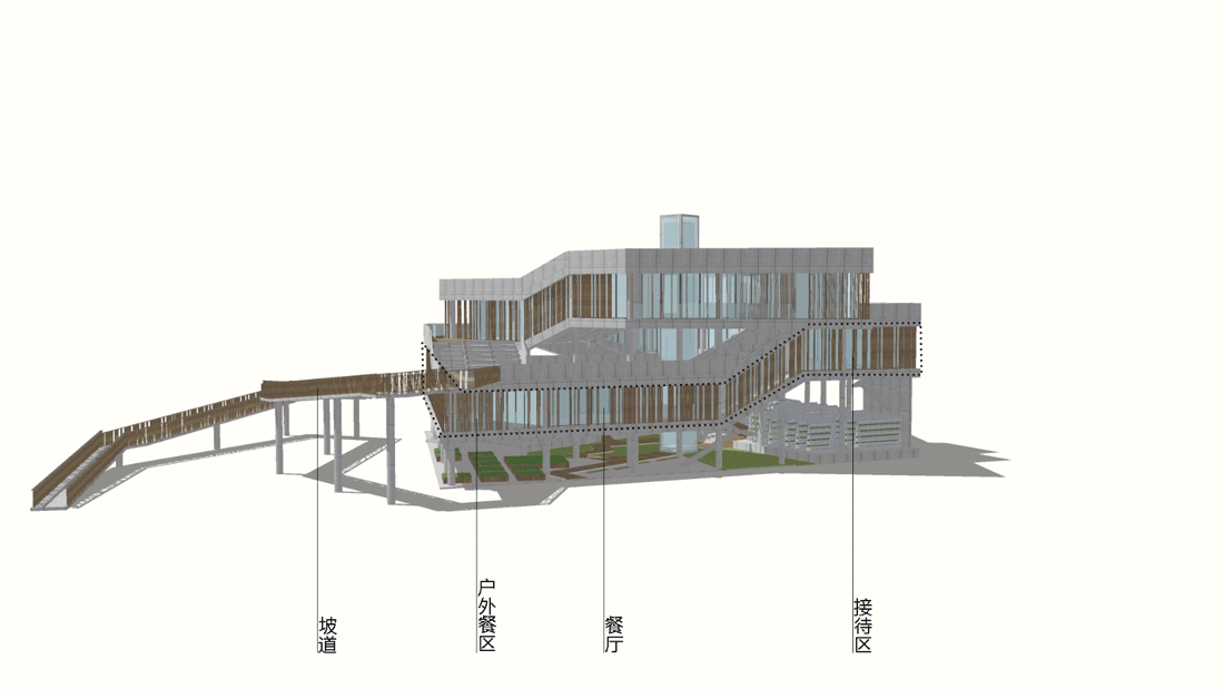 1/2夹层为餐饮层,包含候餐区、就餐区、室外就餐区、开放厨房等;