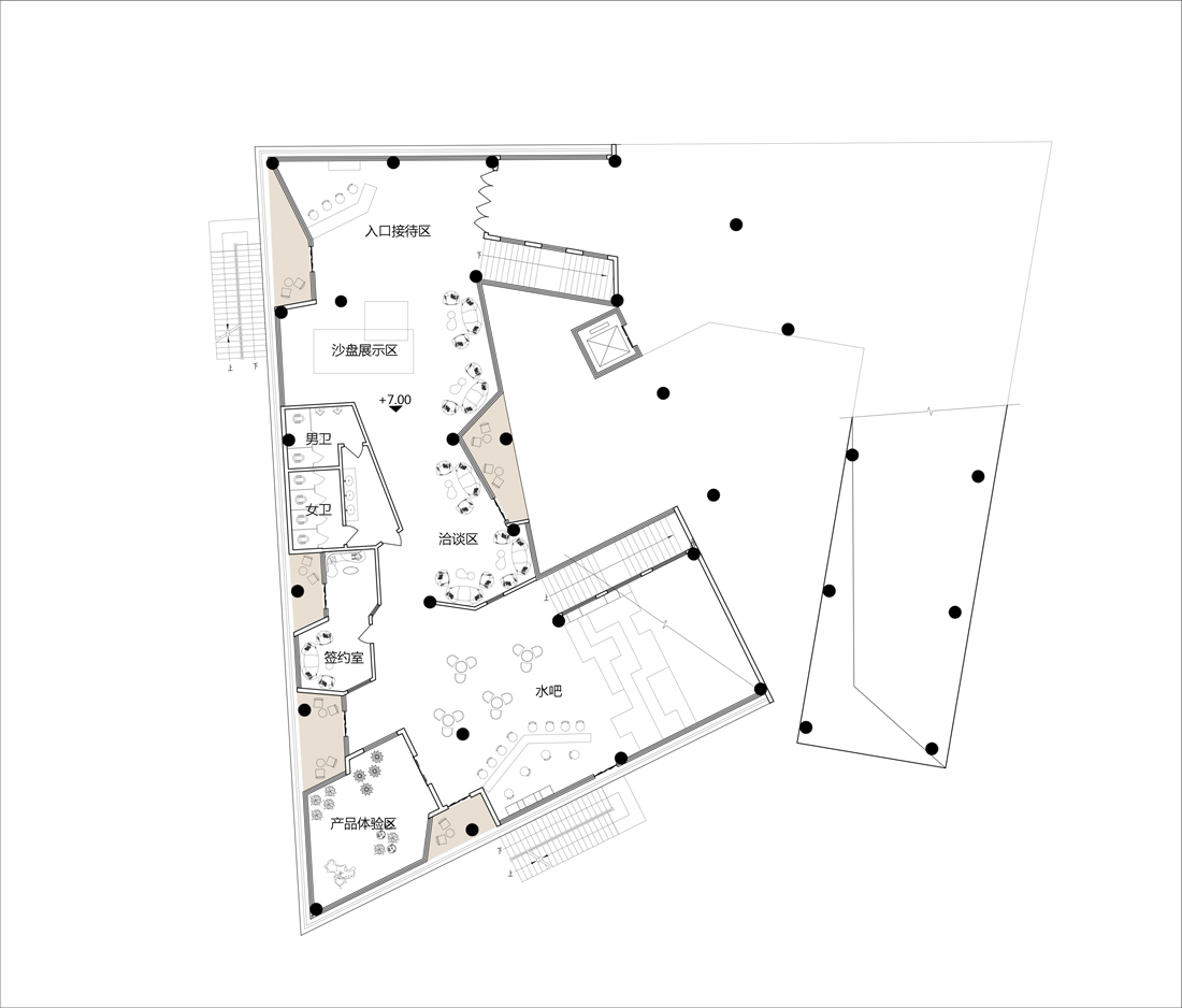 一层则为入口服务展示区,主要设置了接待区、沙盘展示区、洽谈室、产品体验区等;