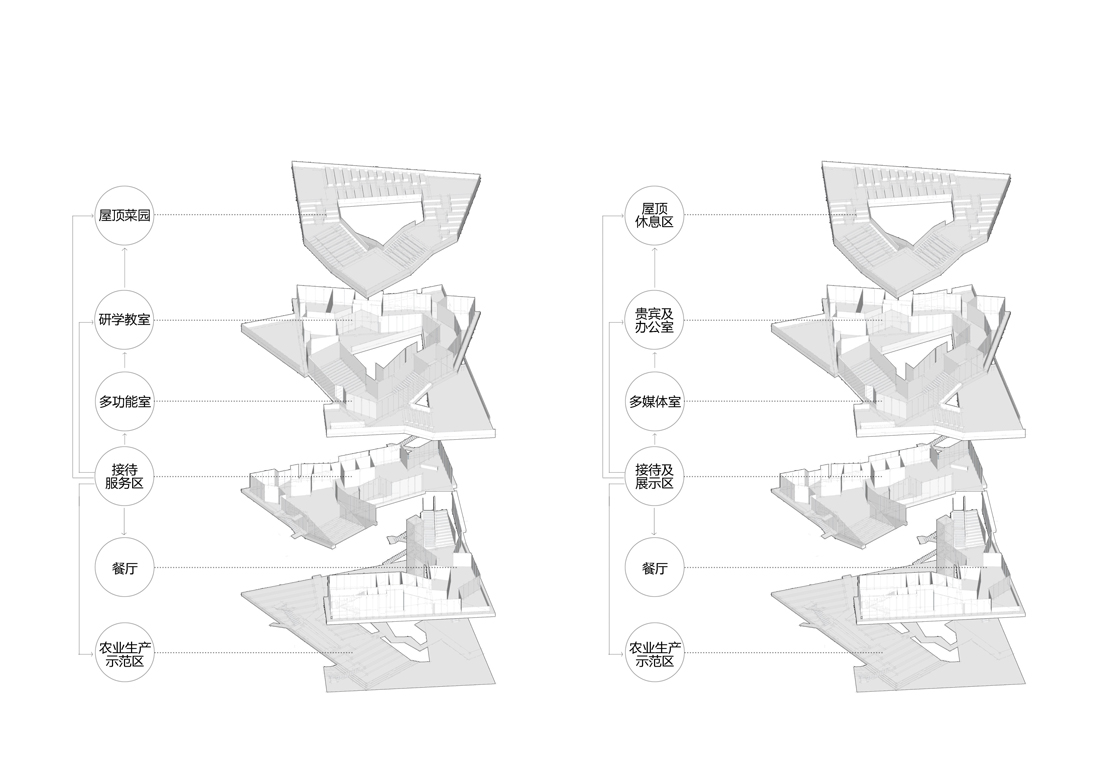 架空层的农业展示区、屋顶的屋顶花园、连接各个区域的栈道,整体给游客的感觉是,整个建筑就像是向阳生长的植物一样,朝气有活力。