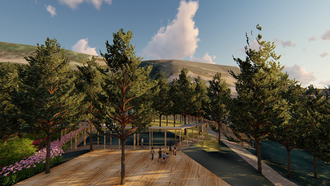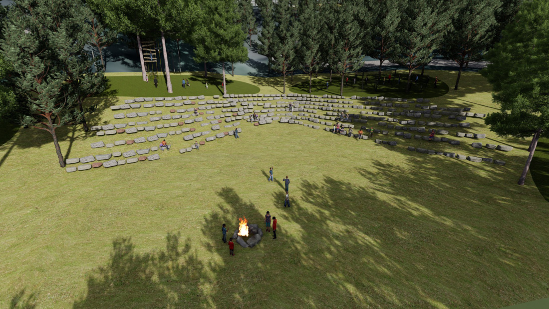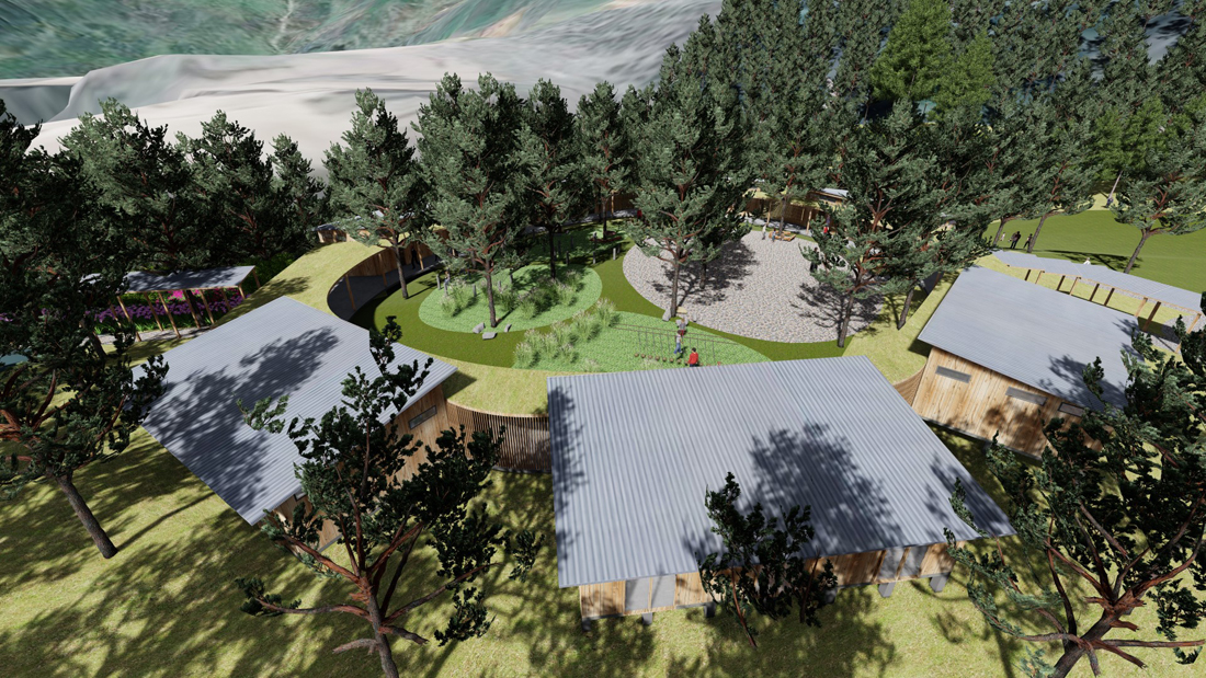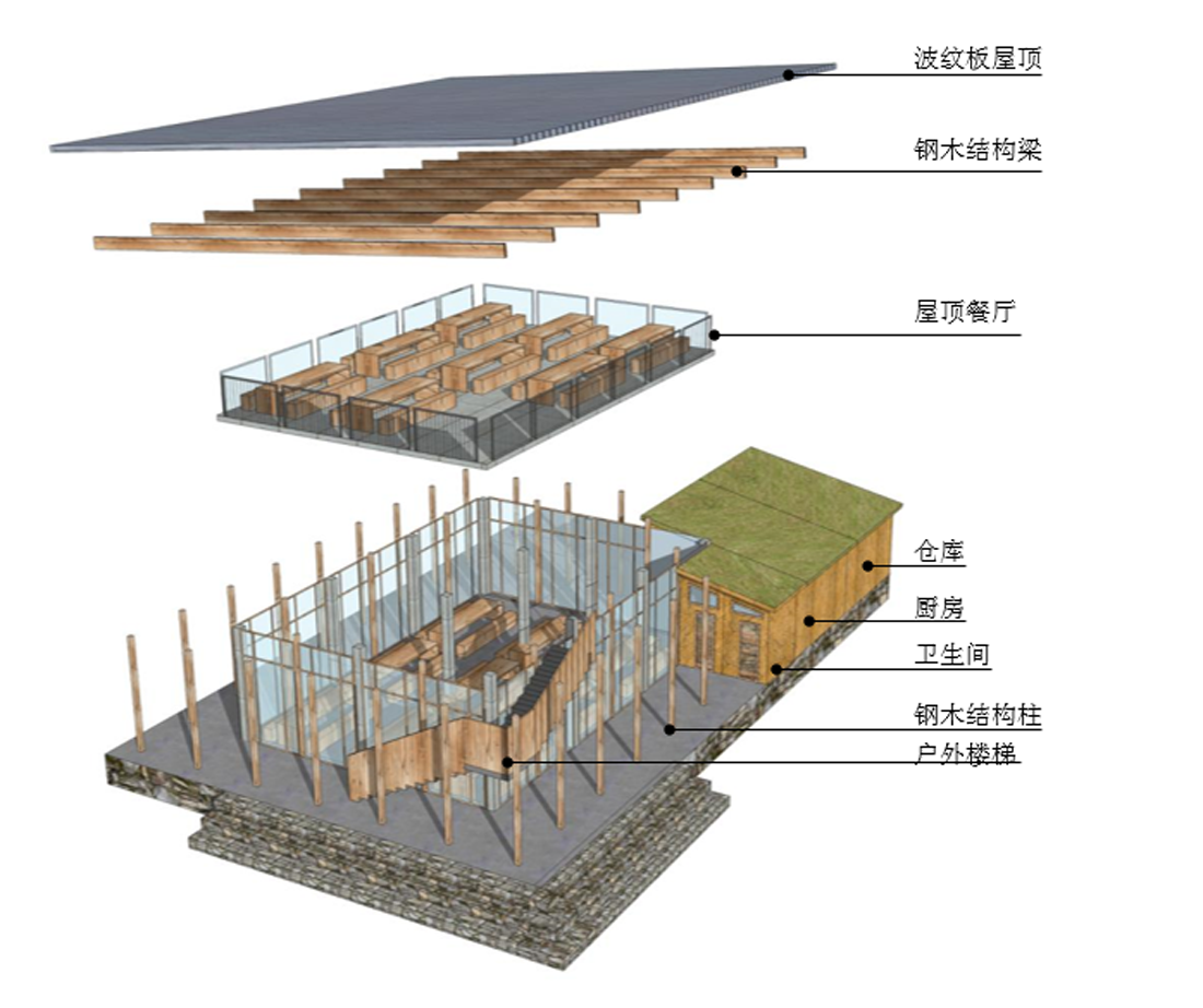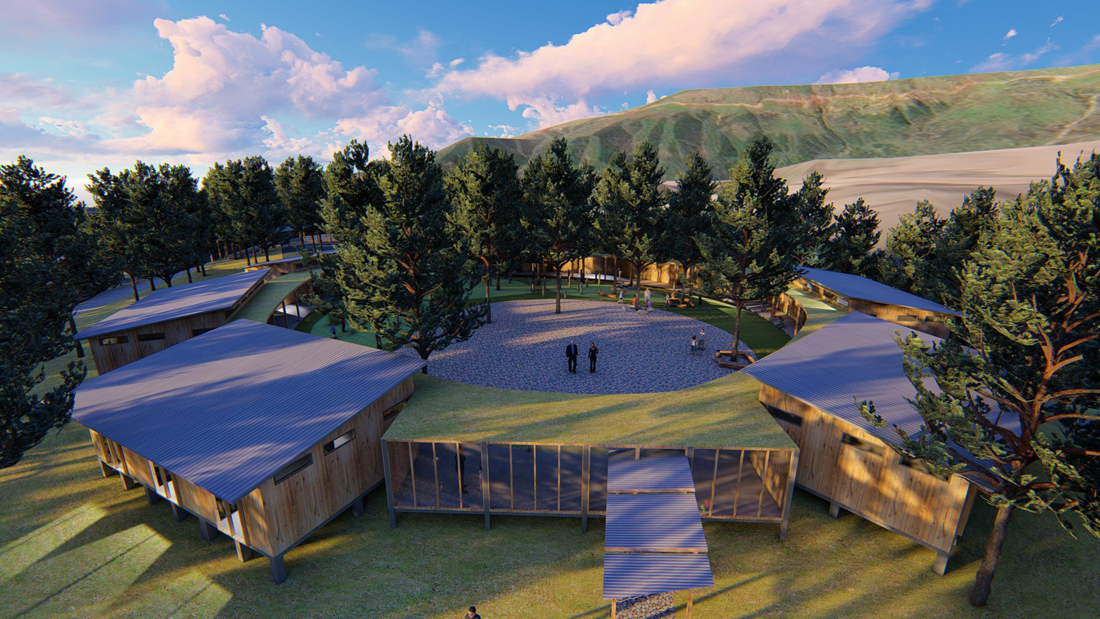 宿舍区采围合起来的宿舍区,在形式上,环形内部自然空间更像是建筑体的院落,院内设置一个火塘,可以让营员们体验彝族烤土豆、火把舞等传统活动;在功能上,环形建筑群利于对营员的管理,保障营地的秩序性及安全性。