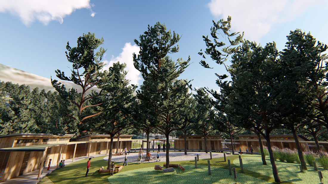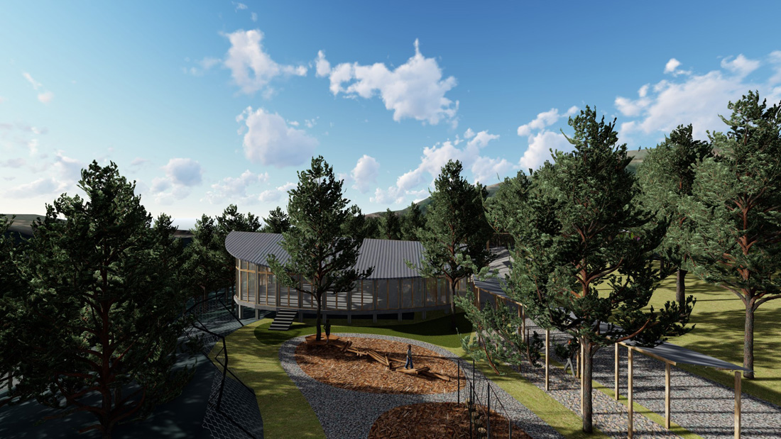 就像森林里会有鸣叫的鸟儿一样,营员也是营地里不能缺少的部分。营地的椭圆形多功能教室就像是森林的一片叶子,折页式的屋顶也像是森林的鸟儿一样,寓意着营员们即便展翅高飞,也会有他的落脚点。
