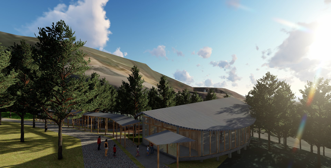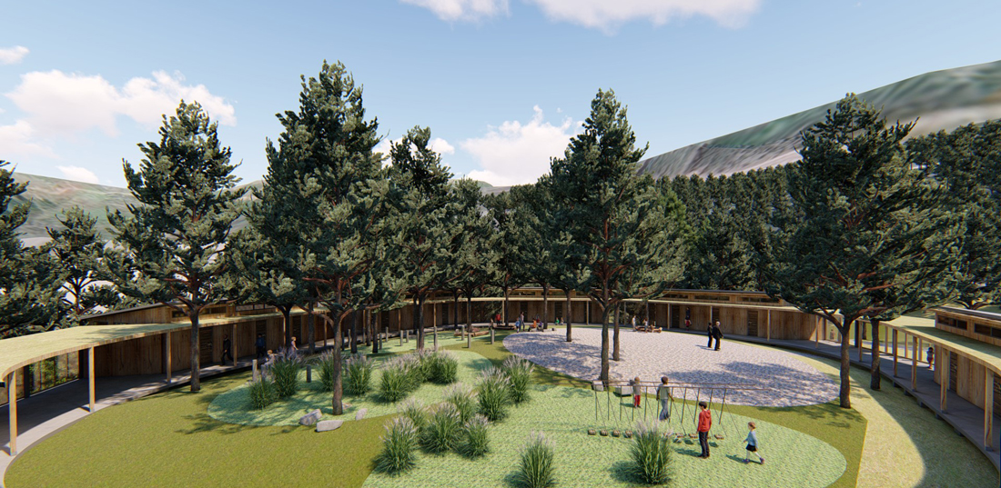宿舍区走廊屋顶采用彝族传统的草坡屋顶,让建筑最大化的融于森林自然。