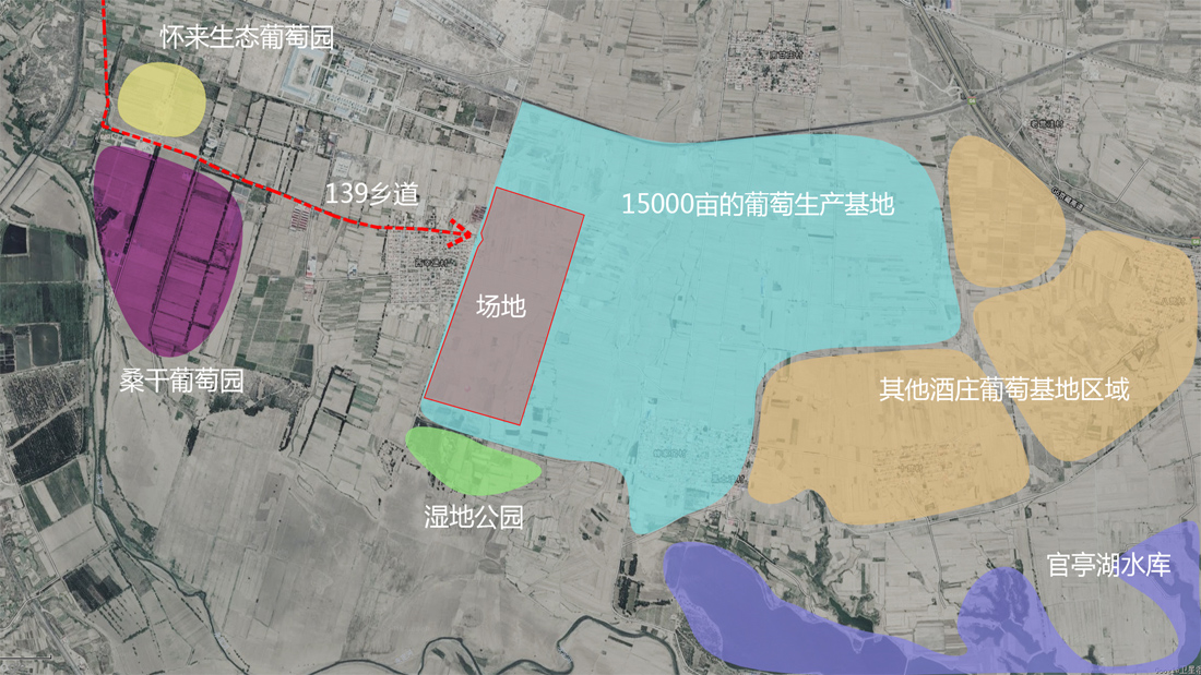 项目的万亩葡萄产业园位于葡萄产业基地的中心位置,途经的139乡道贯穿了葡萄产业基地的怀来生态葡萄园、桑干葡萄园、湿地公园、其他酒庄葡萄基地区域等等。