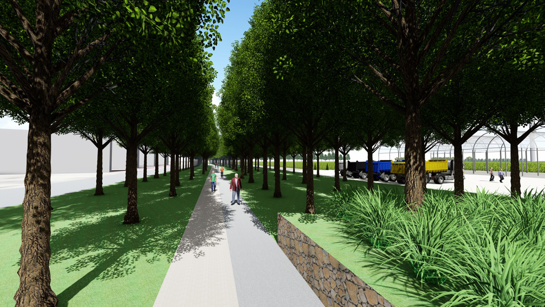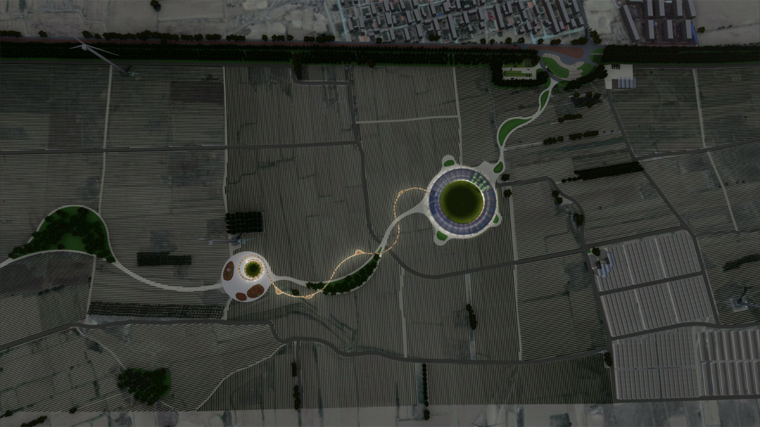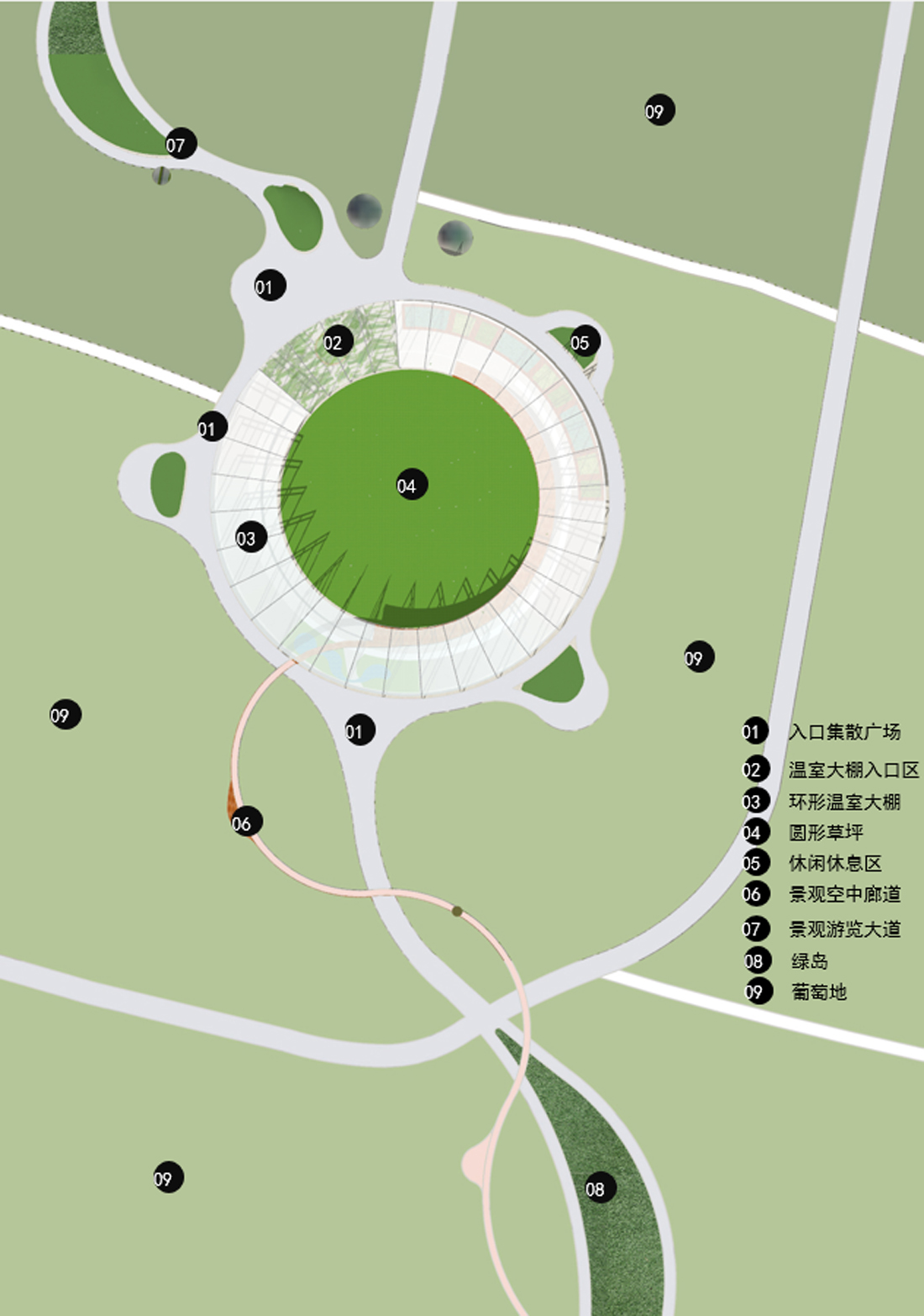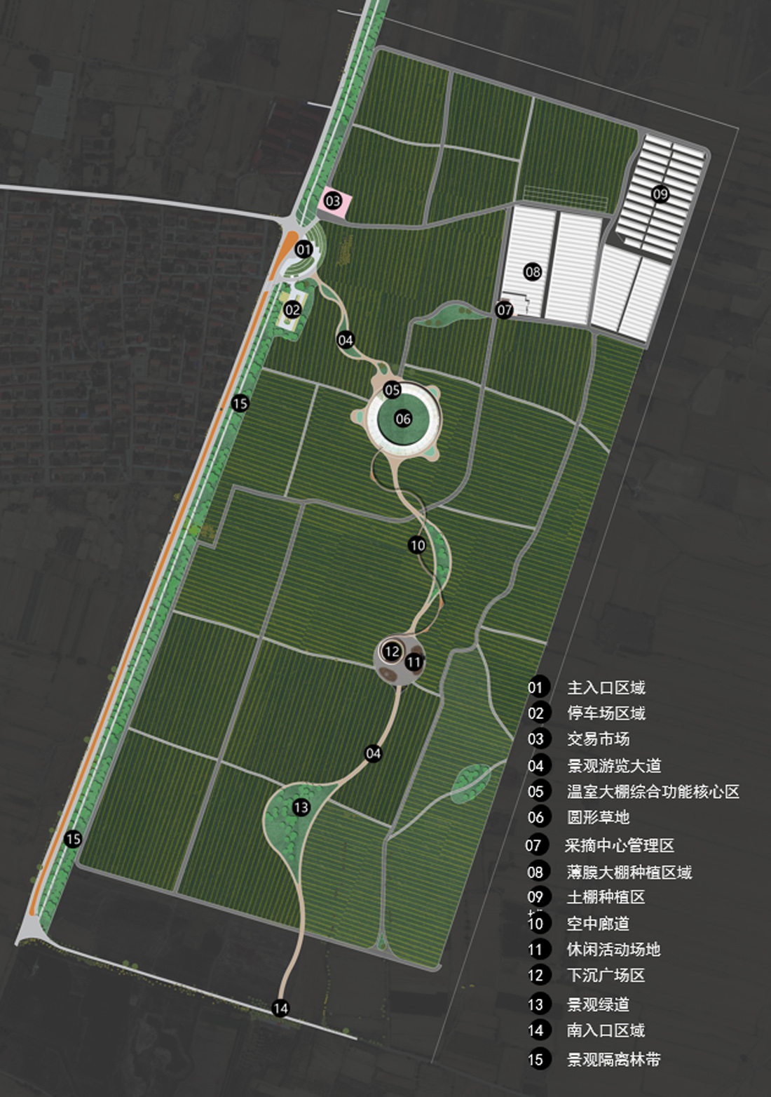 温室大棚区并不是独立的,通过休闲景观道与核心管理区相连,园区内整体看似独立且相连。