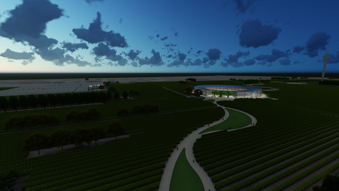 温棚内部主要功能为景观入口区域、仓库、机械用房及园区办公室,葡萄文化展示中心区、温棚热带雨林景观区。
