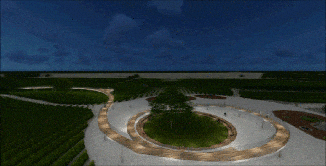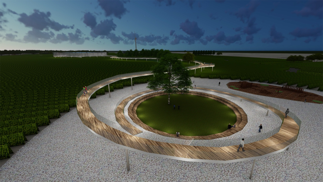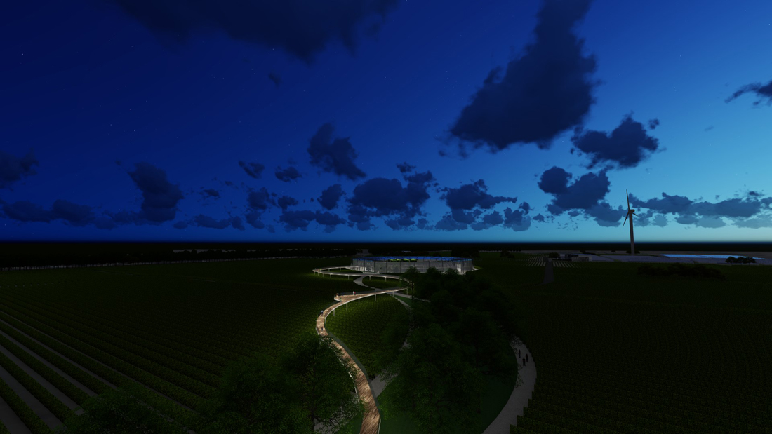 休闲区的附近有几个绿岛,那是参观葡萄生产的区域,也是游客林下休闲区域。通过景观大道把主入口、核心区、休闲区、南入口以及湿地公园连接起来,为进入葡萄园区的游客提供一种观景流线,同时也为湿地公园的游客提供了进入葡萄产业园的客流量。