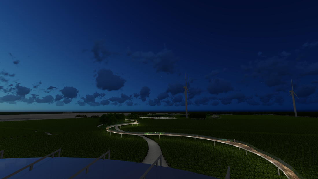 但是,由于场地所在区域地势平坦,设计一条空中廊道,把核心区和休闲活动区连接在一起以外,抬升的高度,抬高了游客的视野,廊道上设计观景平台,可观光周边的风景、远处的湿地公园和官厅湖的风景,游客有更好的观景体验。