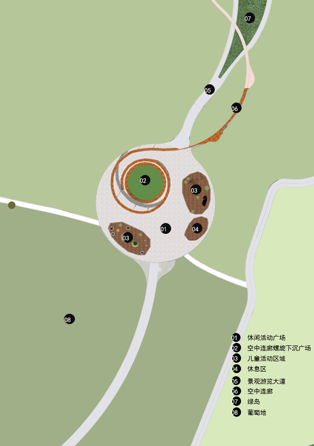 廊道螺旋下降,形成一个包围空间,利于场地下沉处理设计成一个可聚会、休息和活动的场所。活动区设计也有提供给儿童体验的户外场所。