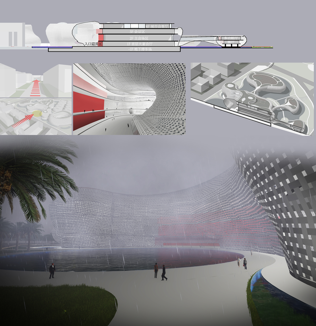 编织的概念十分切合国际会议中心的形象,这寓意着把人与自然、各个国家或地区的思想、人才、技术、经济等有效的融合在一起,形成一个动态的稳定的渗透环境中。