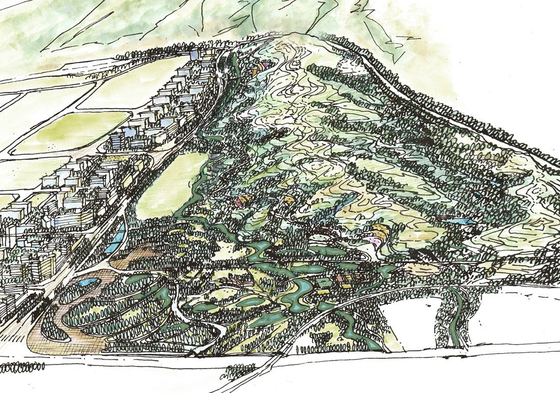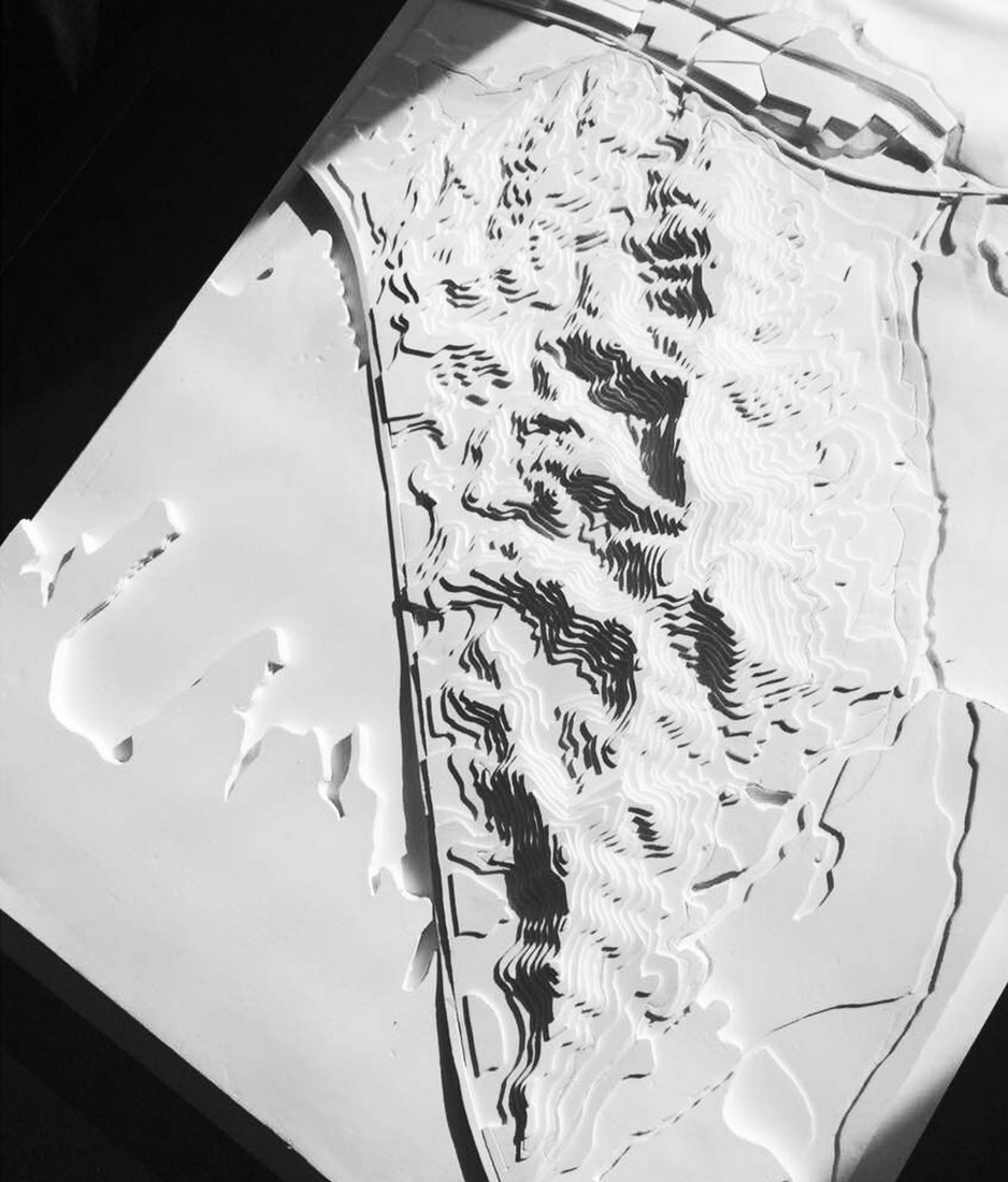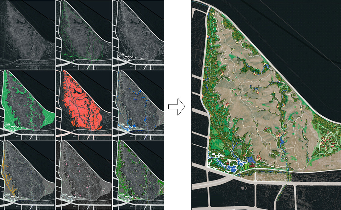 通过手工山体模型,对山体结构有了更清晰直观的认识。结合狼山山体特点与公园设计客观需要,我们调研了狼山现有植被,对山体环境做了水脉走向分析、坡度坡向分析、日照分析,最佳种植区域,需要保留地区分析,最佳种植区分析等,通过叠加组合分析和节点设计最终得到公园的总体平面图。