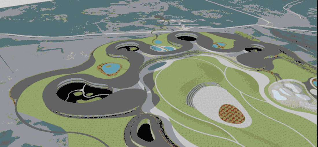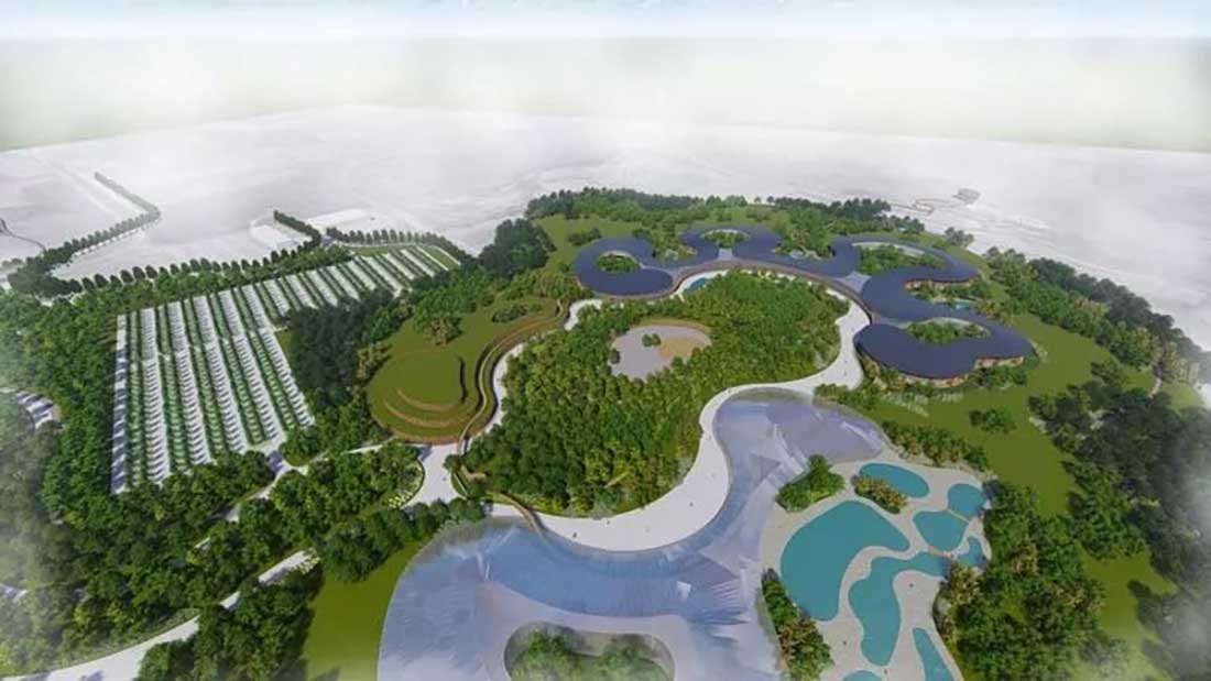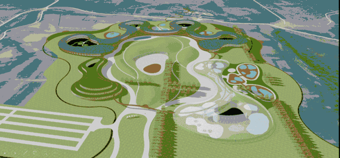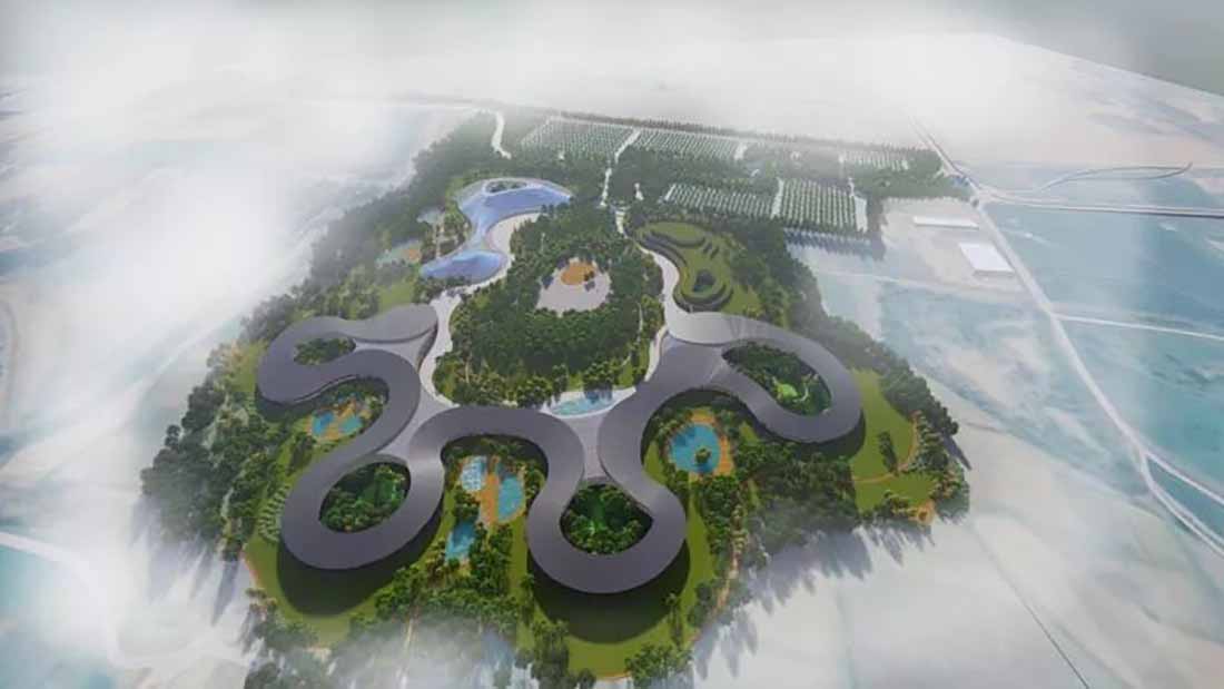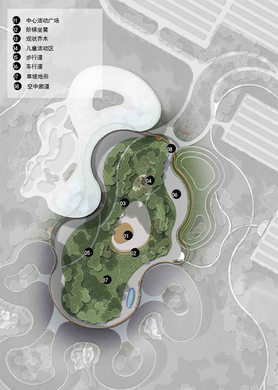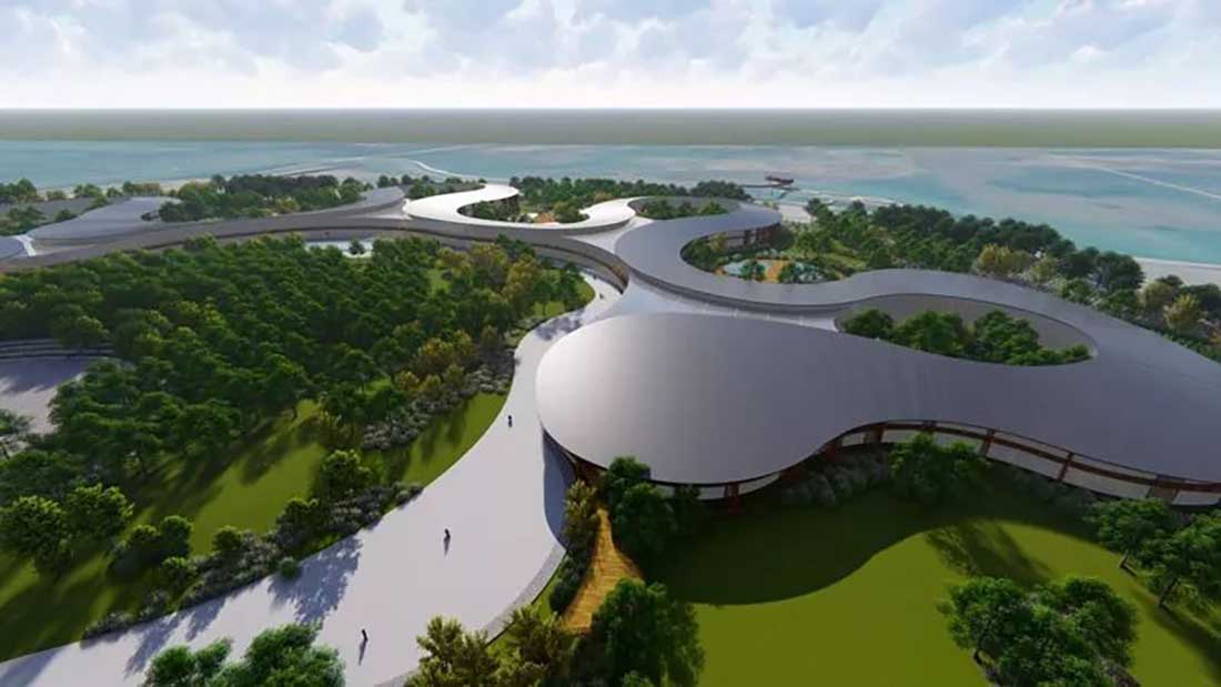 俯瞰像祥云造型一样的建筑是温泉度假区的酒店建筑,曲面的建筑造型,让住户能够欣赏不同方向的景观,也让湿地公园的景观最大程度的展现在住户面前。