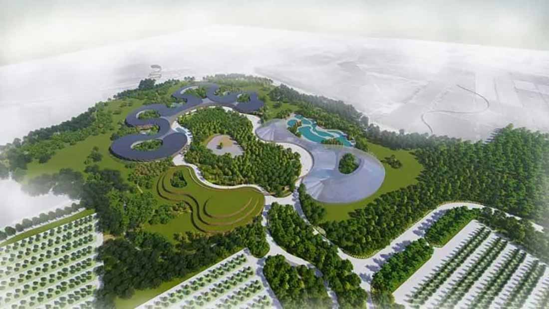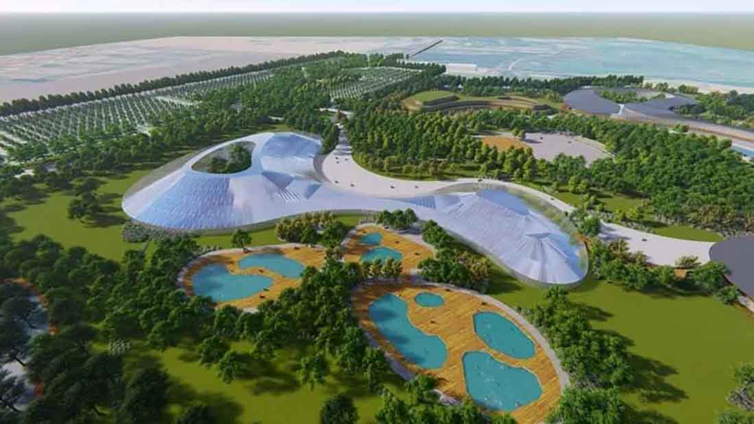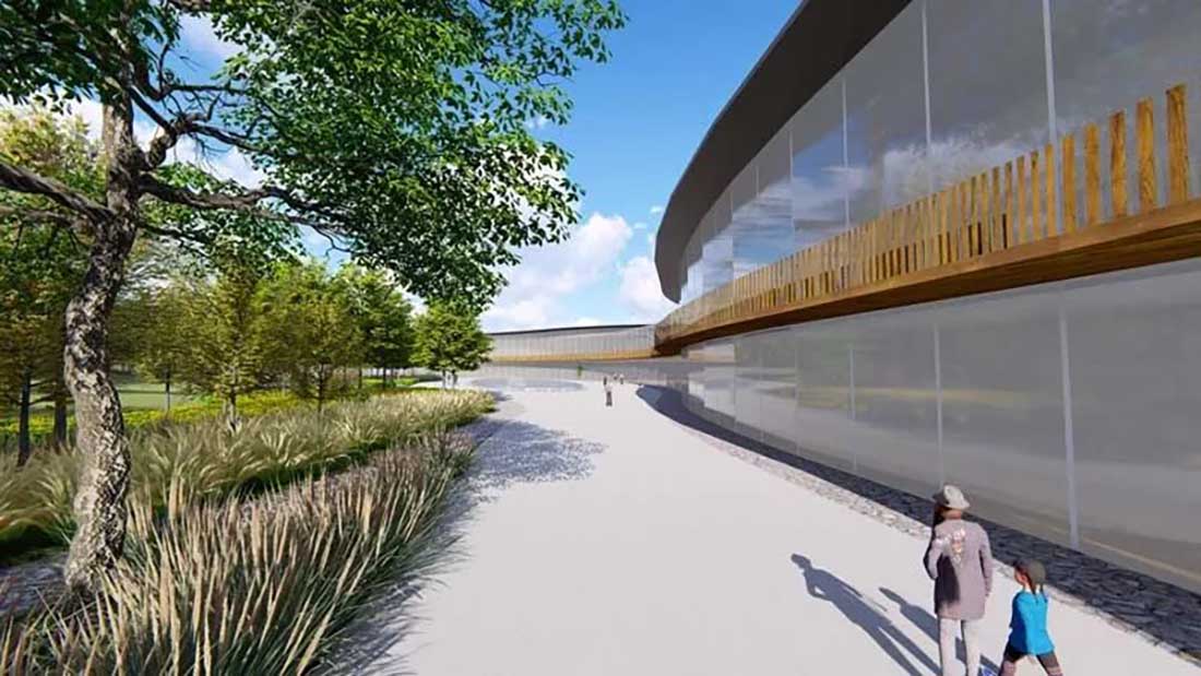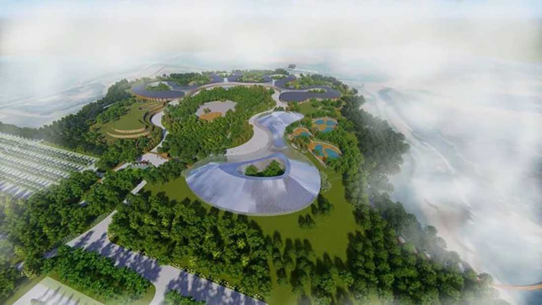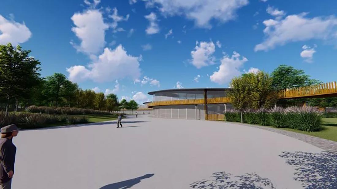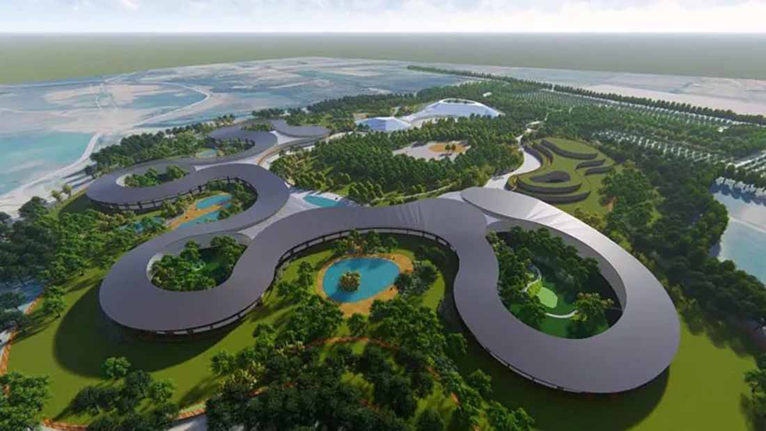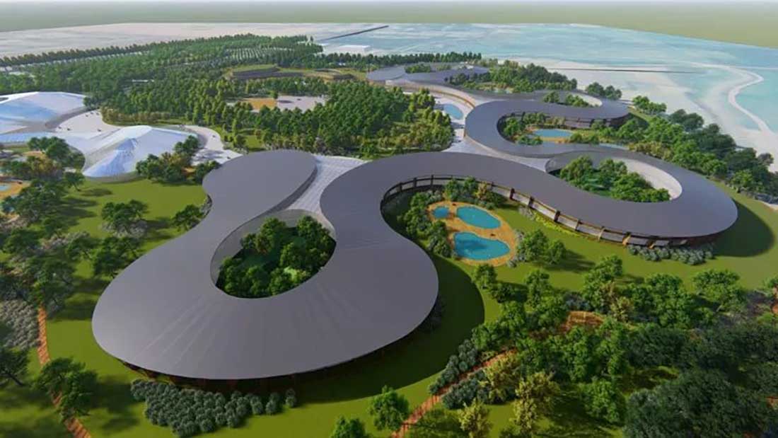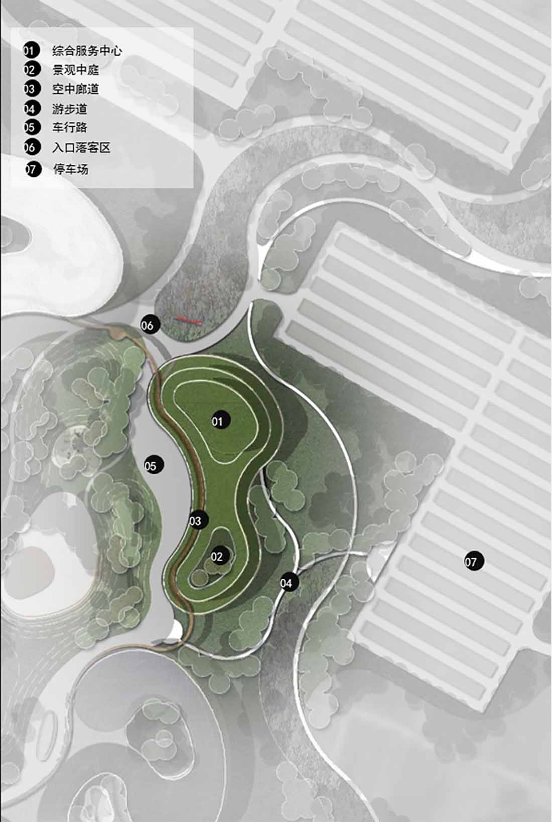 综合接待区是一栋绿色的“梯田建筑”,乍看与自然环境融为一体,但是却十分醒目。建筑外还有空中连廊,以便游客可以一边欣赏着周边自然风光,一边从接待区去往其他分区。