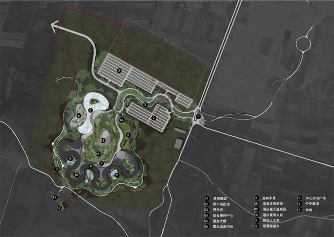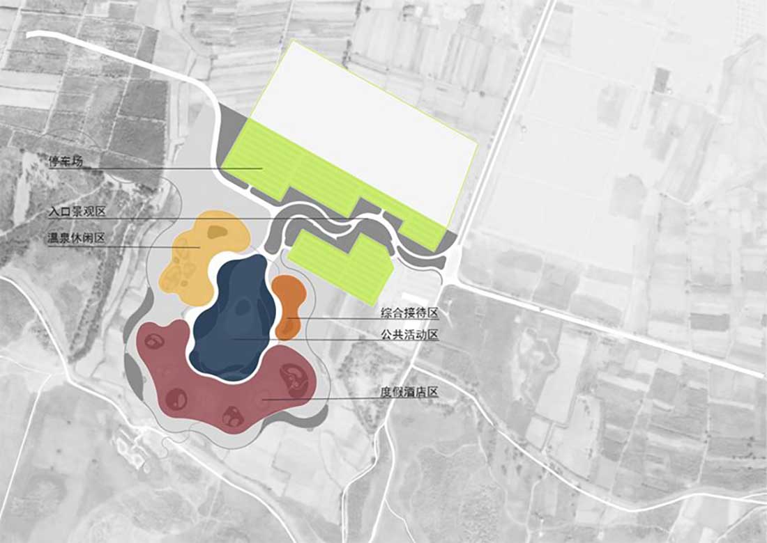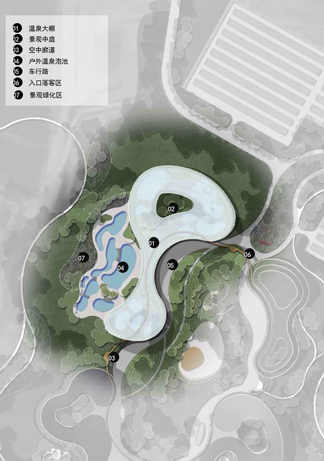 根据场地的功能需求,主要分为以下五个功能区:入口景观区、综合接待区、温泉休闲区、度假酒店区、公共活动区。每个分区都有设计的连廊串联起来,让每个分区的活动变得独立却又紧密。