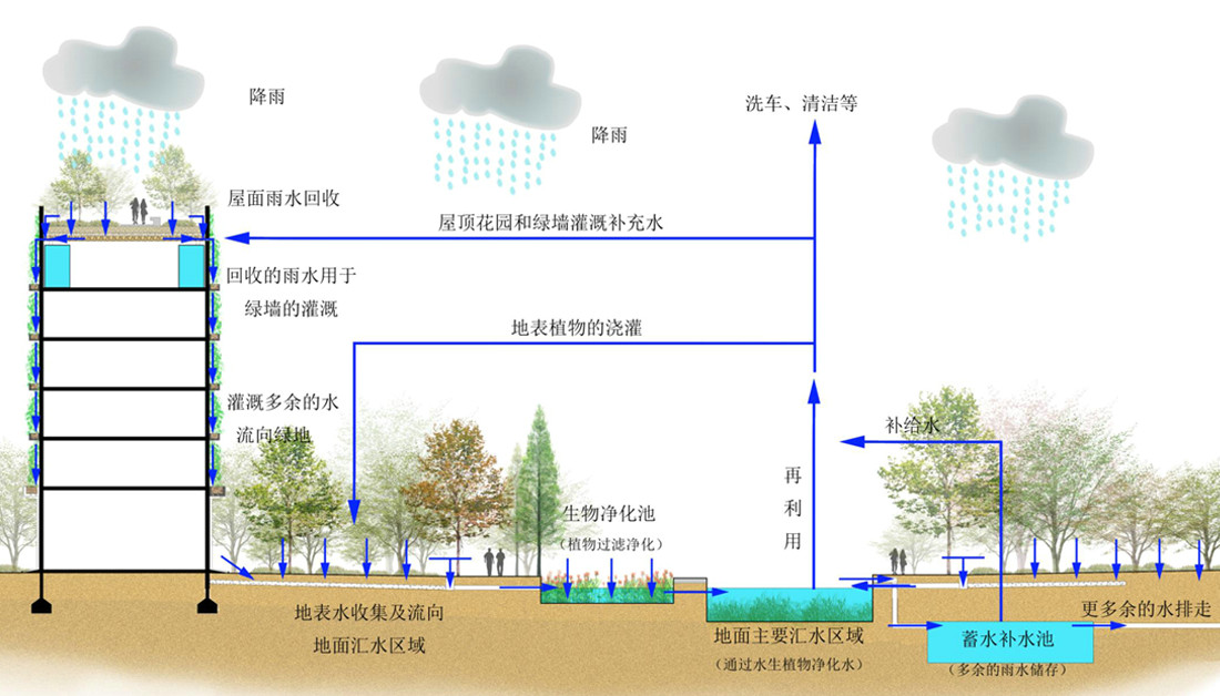 保证未来的漫长发展中,原生的生态系统可以得到恢复。例如,将场地中的生物碳(垃圾或枯萎的植物)用来做再生能源发电;场地中的雨水、中水回收再利用。