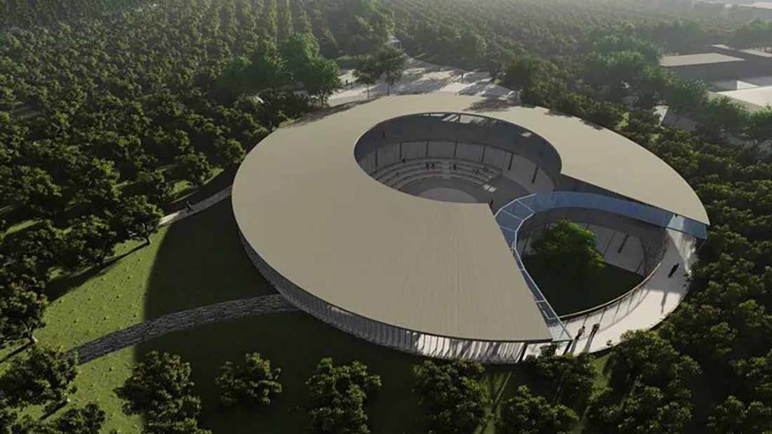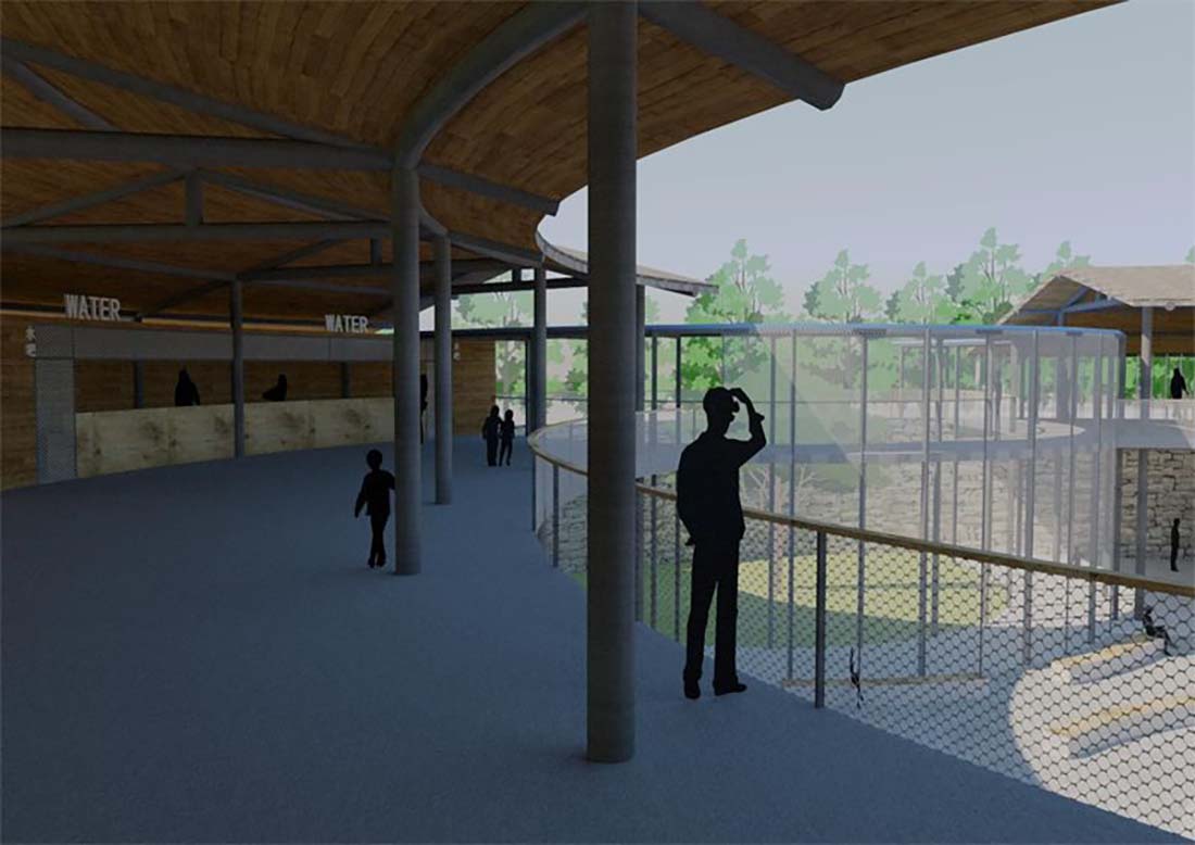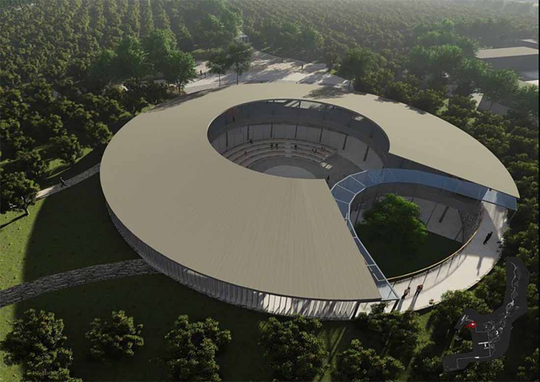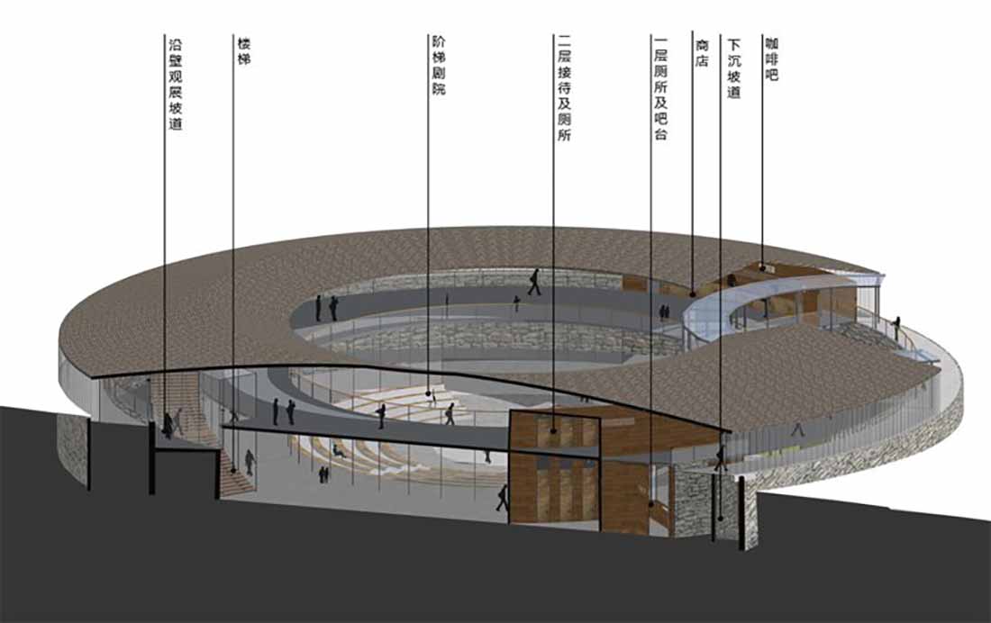 中庭的圆形广场作为整个接待中心设计的核心交流场所,从空间设计上塑造一种强烈的归属感与开阔感。广场面朝小花园广场作为主舞台,视线整体开阔,目之所及的蓝天与森林,让剧场变得清新,具有生命力。