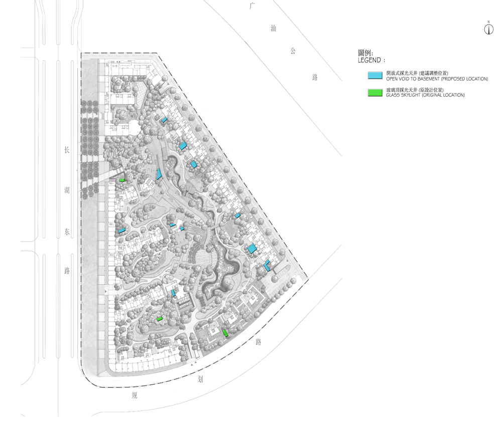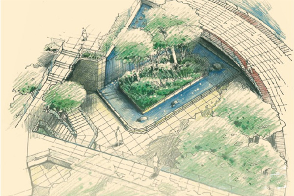 利用车库创造上下连通的立体景观,有效的空间组织维持小区的原有形态和可持续发展。十余处的顶板开口增加车库的自然采光和通风,中心水景以瀑布的形式与下沉庭院的植被园林相结合,再以涌泉的方式实现回流。使用生态环保的车库设计手法,在节能的同时使车库成为能呼吸的地下景观空气更加清新。
