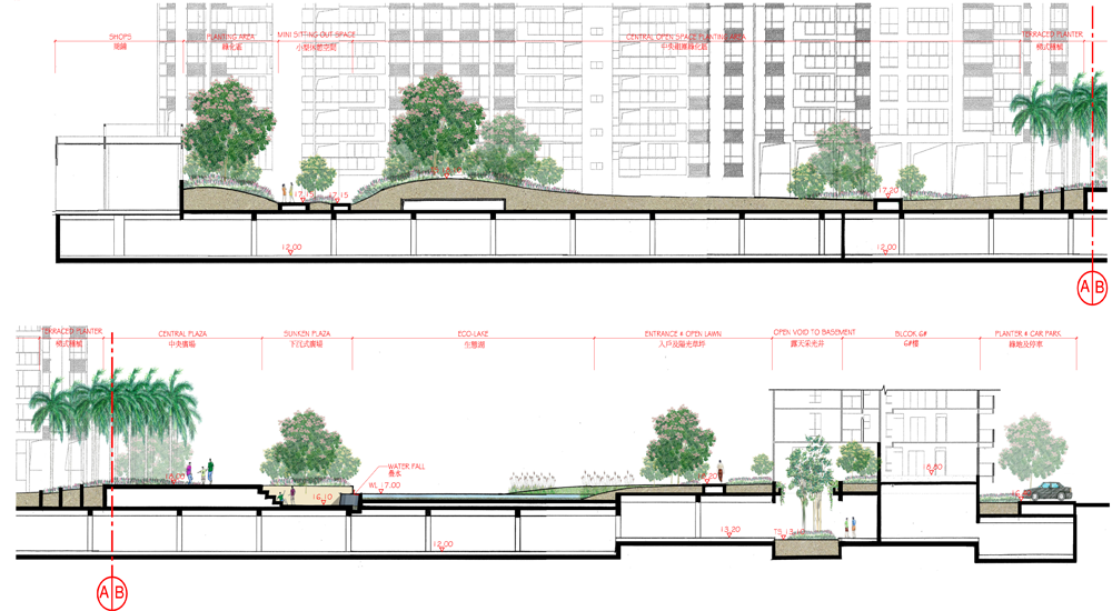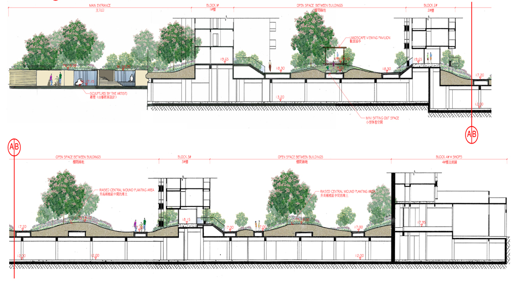 WAQI的设想是利用高差及立体种植丰富住宅区内景观,将住宅区内的架空层成为景观的一部分。通过景观设计使人车分流,以达到优化场地的生态功能。除此之外,WAQI灵活运用当地的树种和当地石材,景观规划的同时使得建设资金发挥最大的效用。