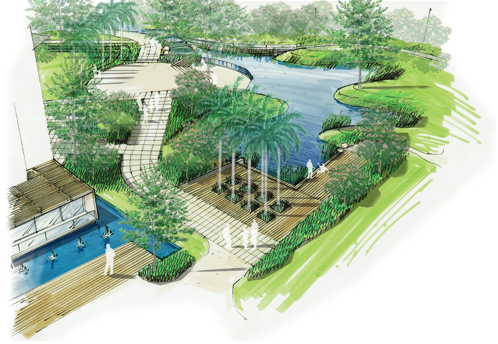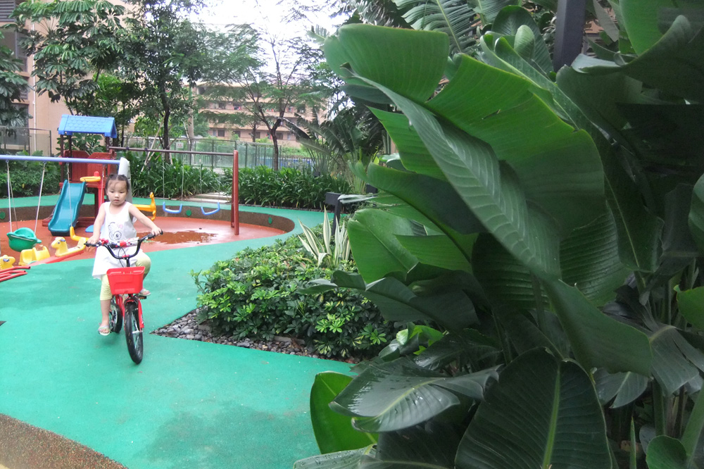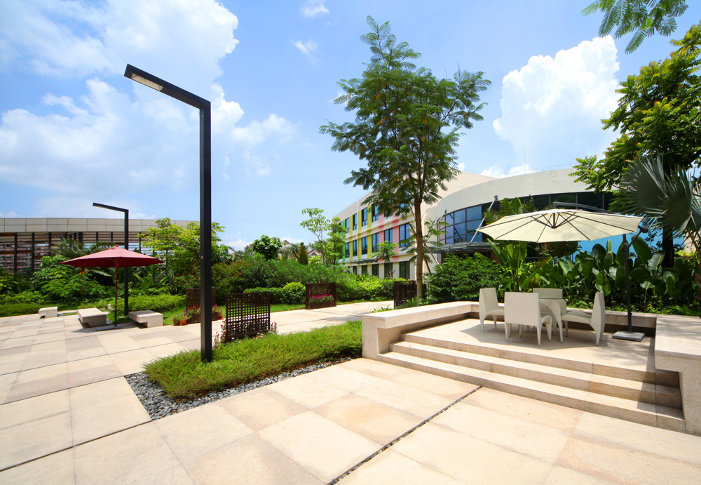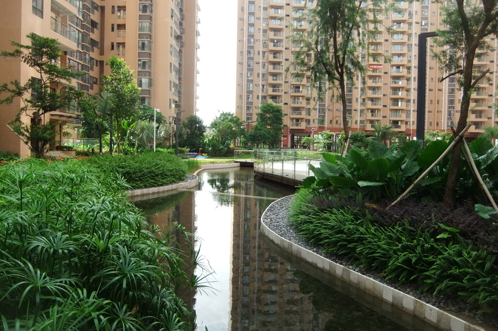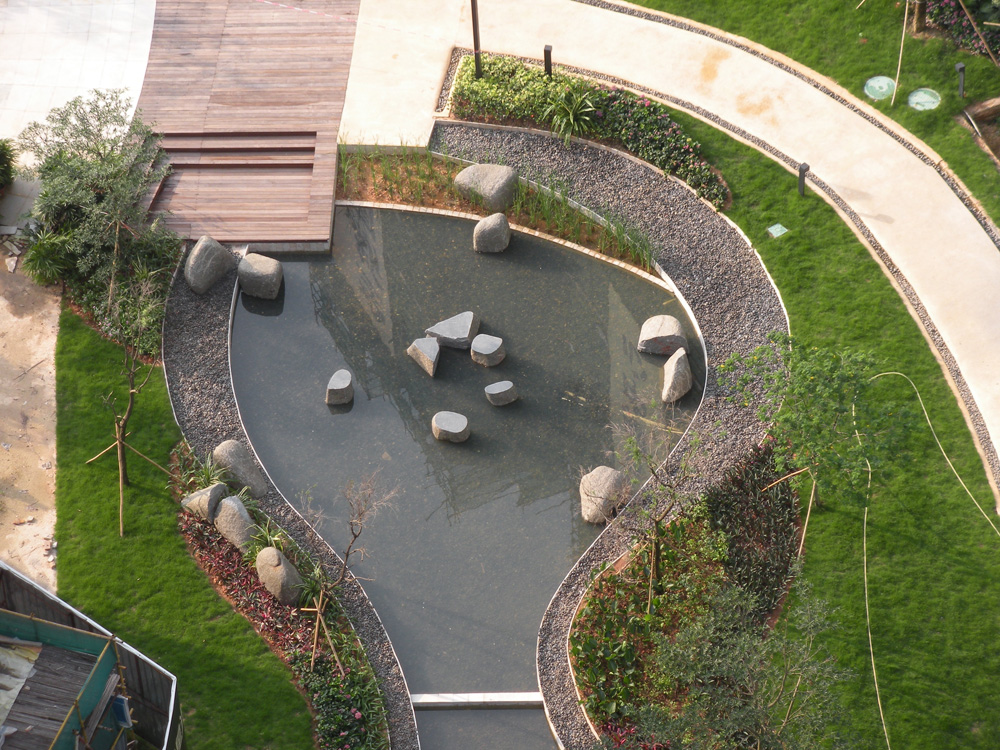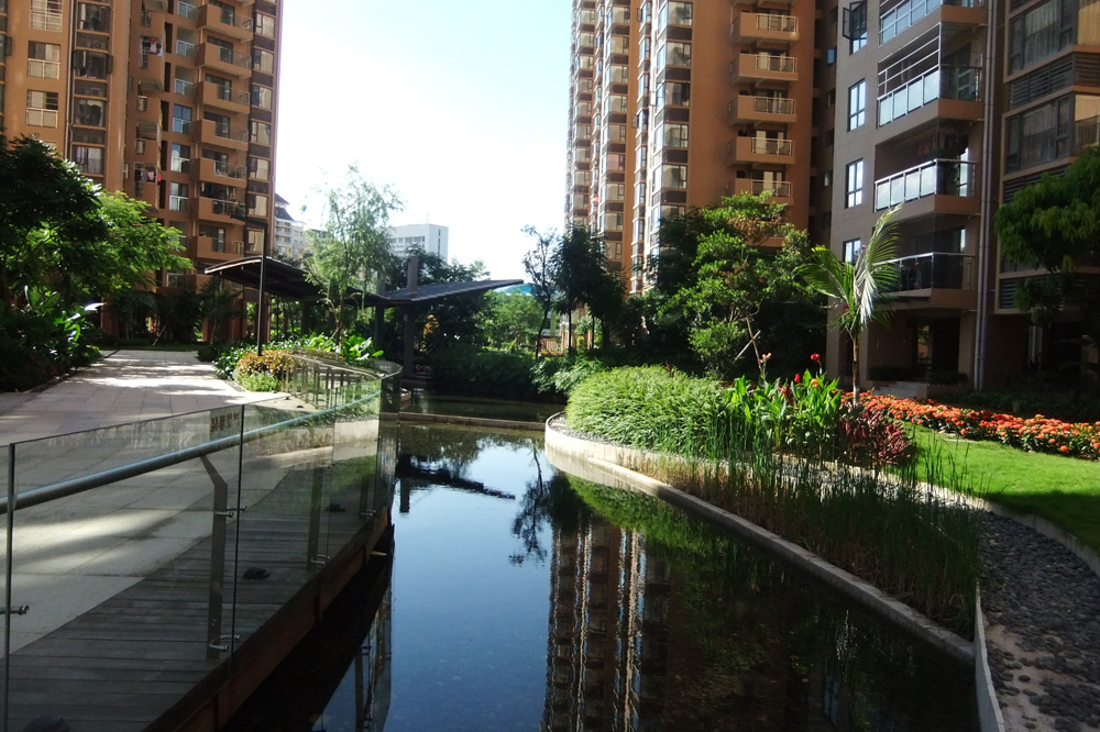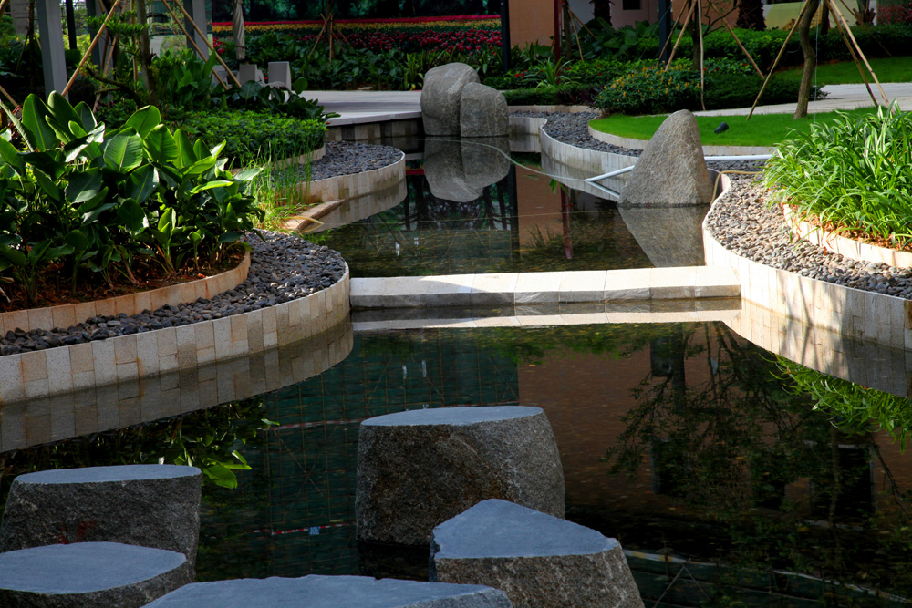 WAQI将社区的水元素以简单的曲线形式呈现出来,并在旁边栽种了地被和热带植被以更好地突出水元素。生态循环的水景设计,为小区造了个小的雨水收集系统,生态环保更具生态意义。