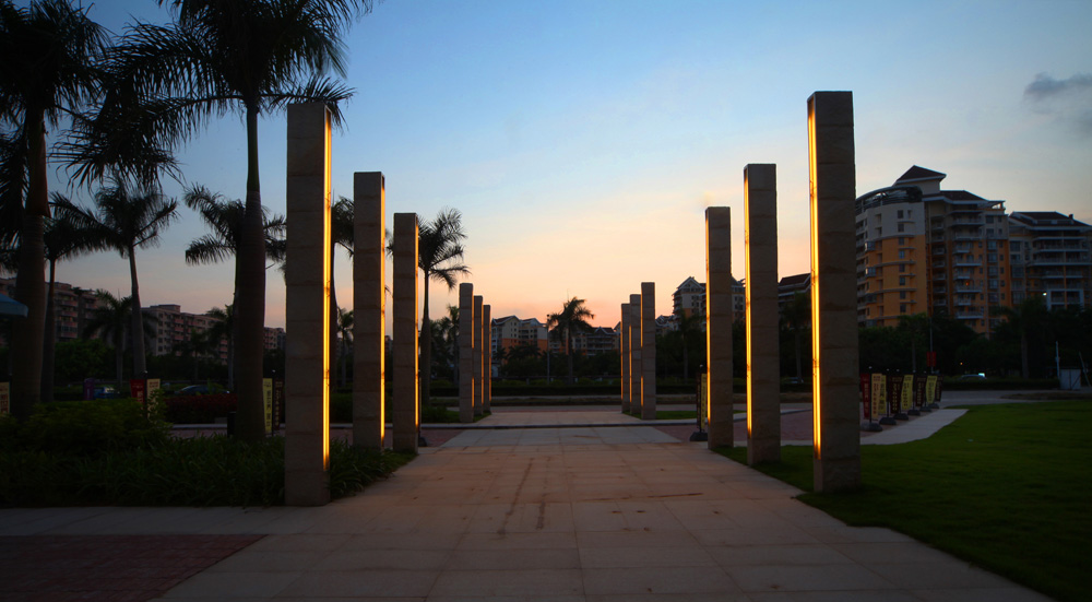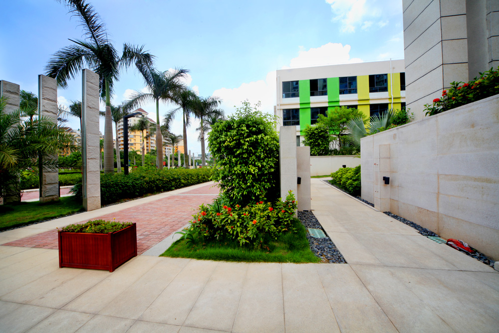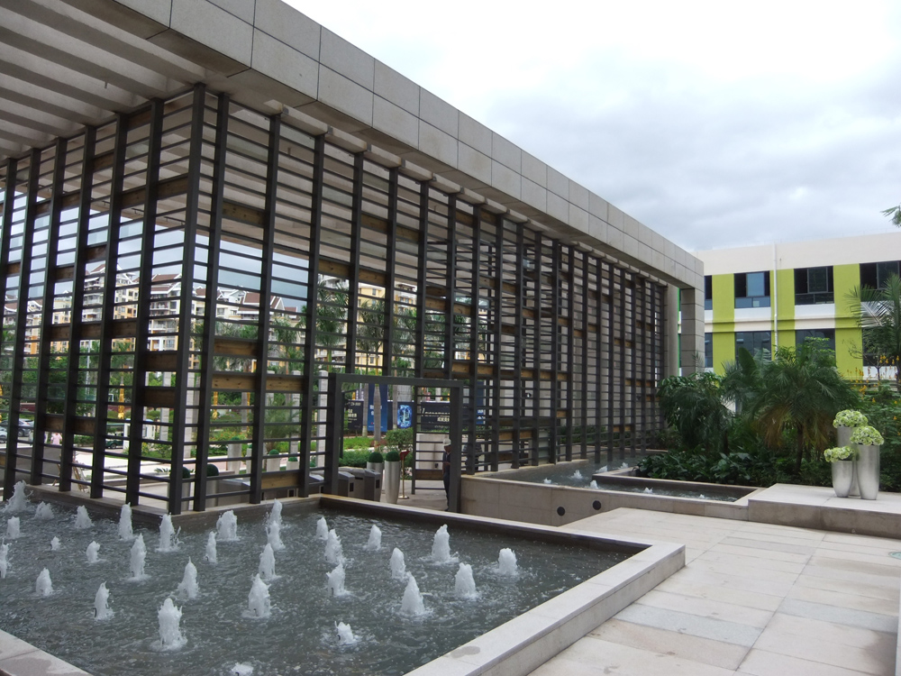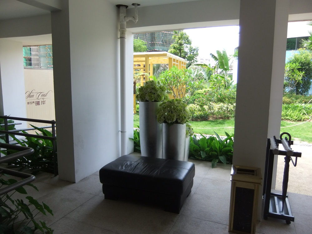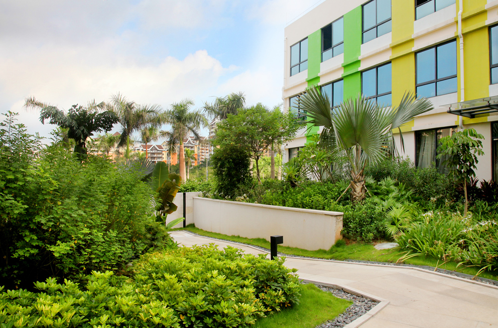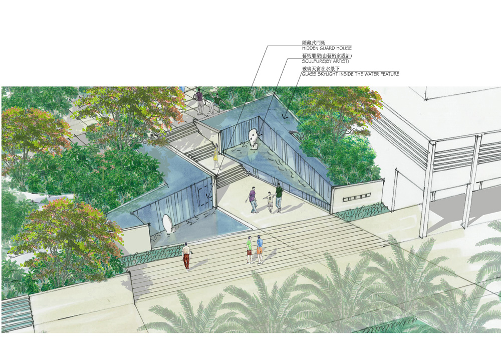 住宅区的主入口种植着热带植物,场地随高差变化形成垂幕式的水景大门,结合现代雕塑的点缀,透露出社区内盎然的绿意。为了不破坏入口景观的整体感,门卫室被悄悄藏在的水幕之后。