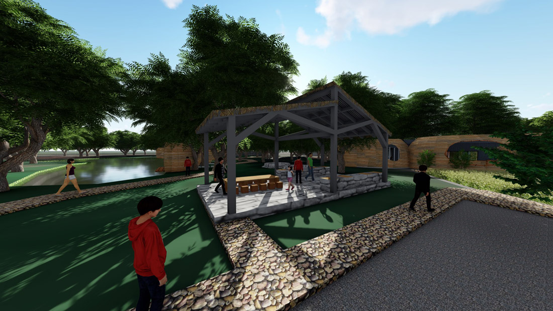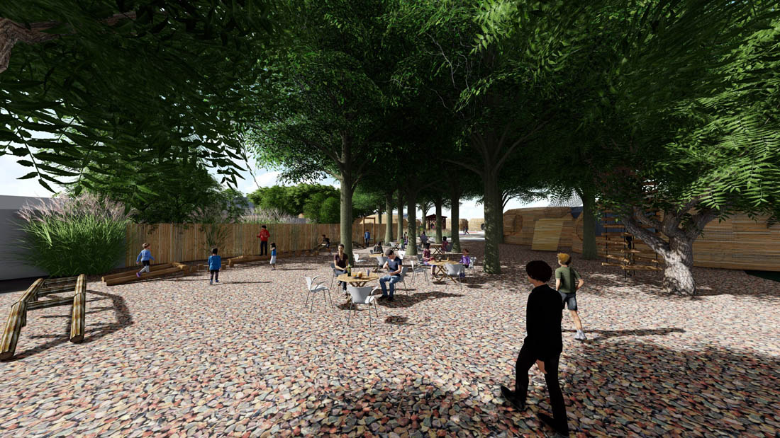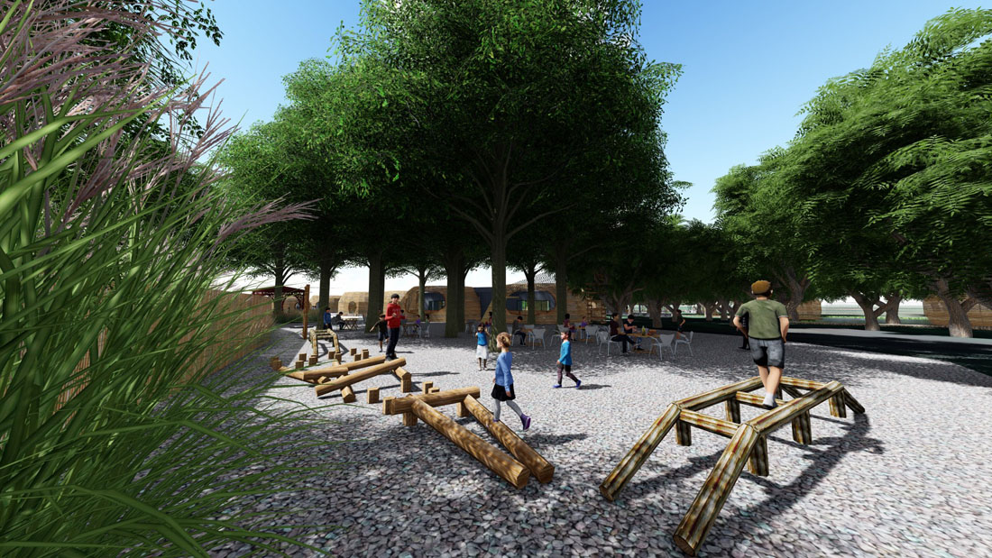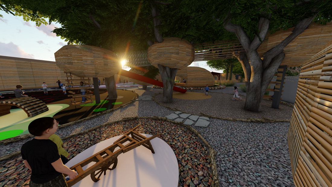 农庄该区域的大树长势较高,有很好的林下活动空间,现状的砾石铺地的感觉也非常符合农庄氛围。WAQI设置了一些休闲娱乐的林下活动,让游客能在该区域进行休息。