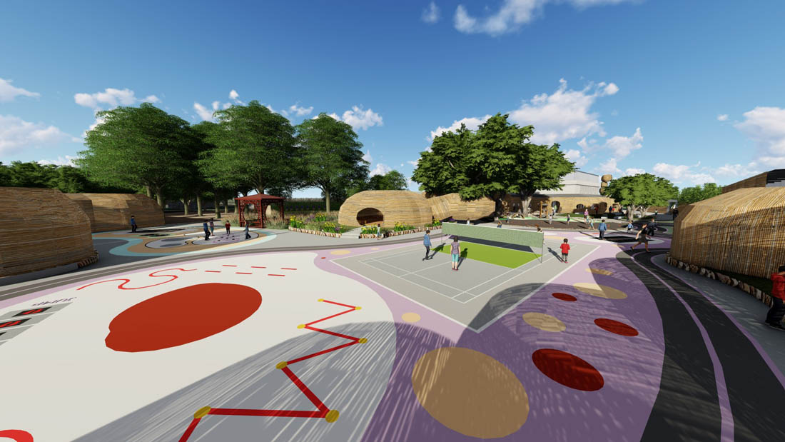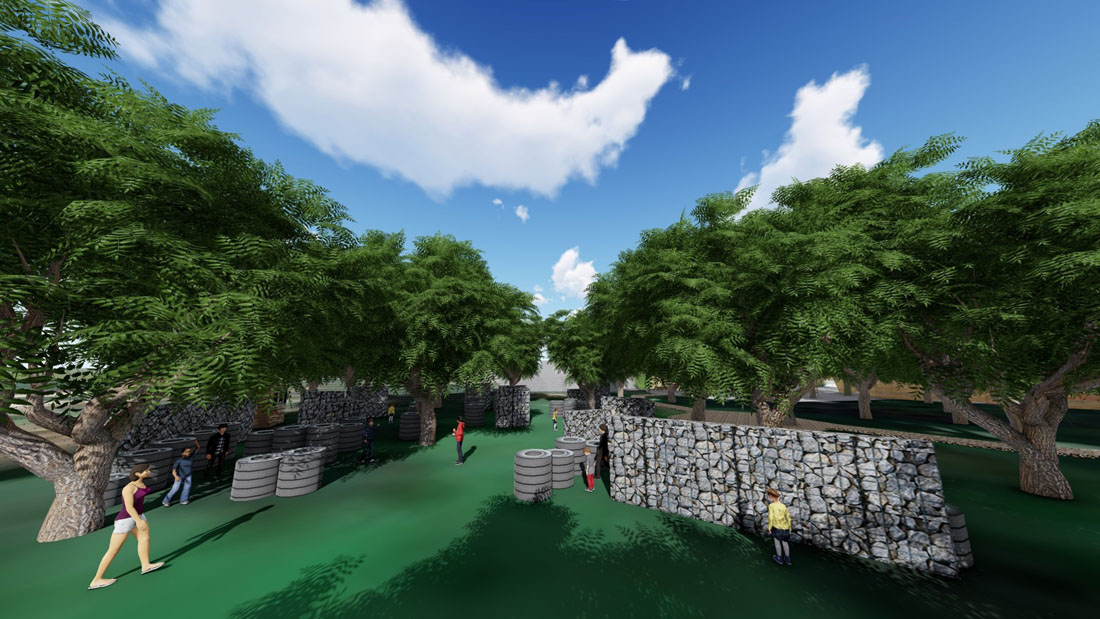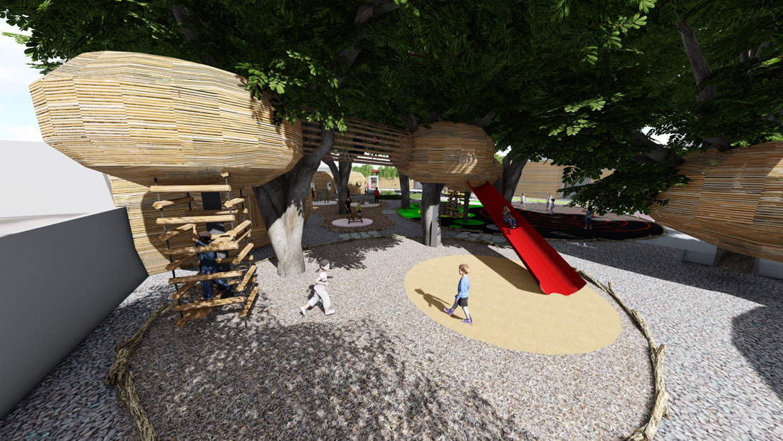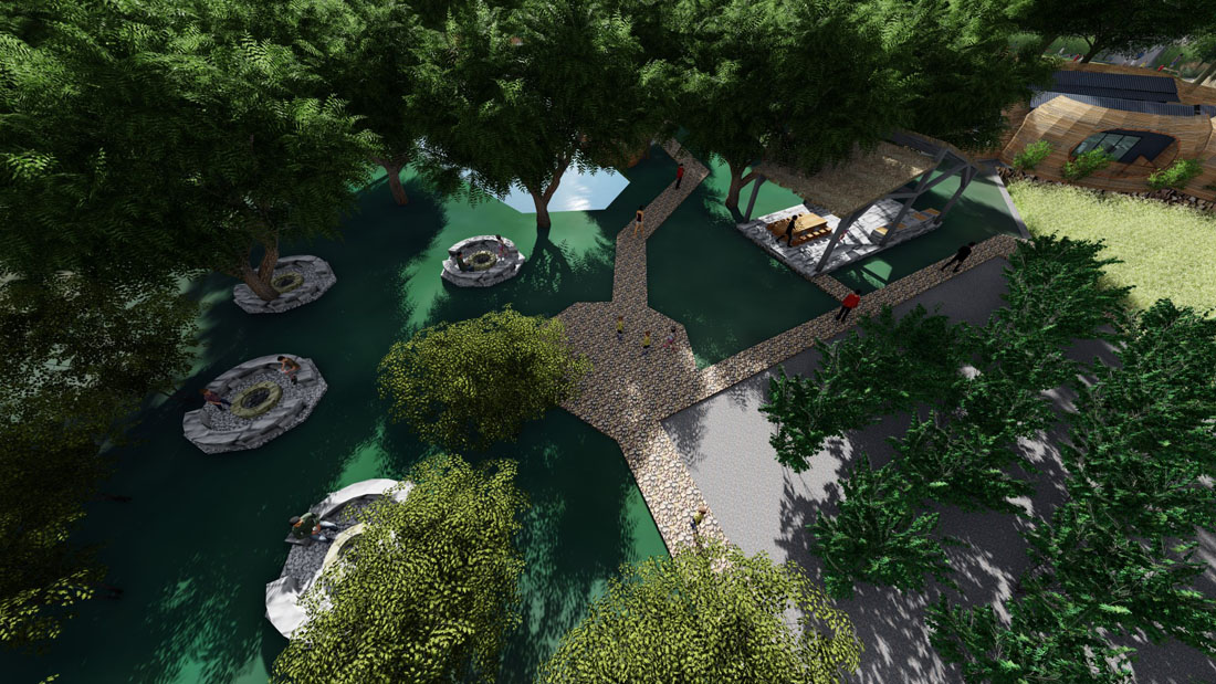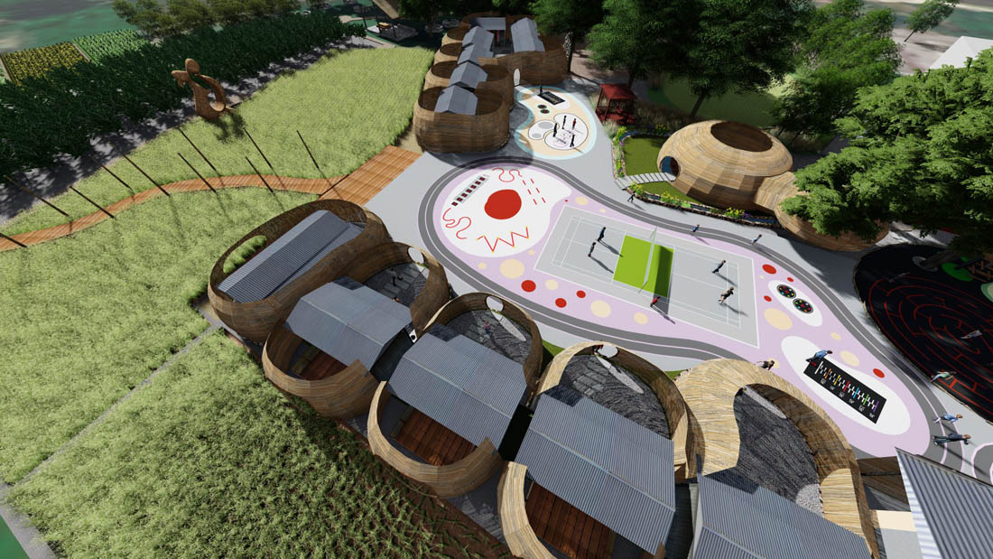 农庄该区域的大树长势较高,有很好的林下活动空间,现状的砾石铺地的感觉也非常符合农庄氛围。WAQI设置了一些休闲娱乐的林下活动,让游客能在该区域进行休息。