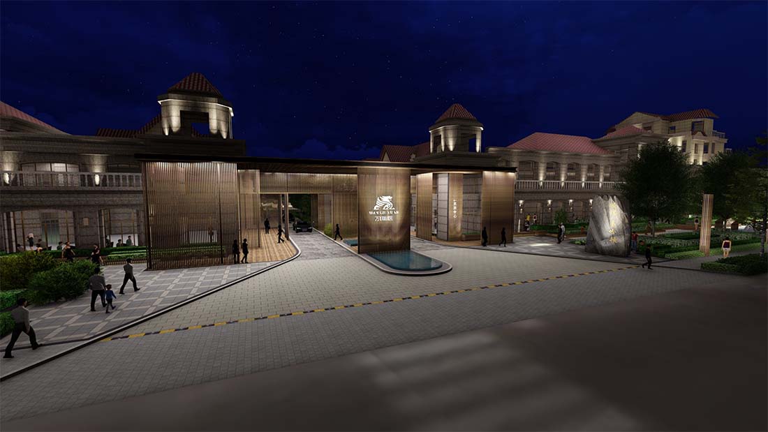 一种是拆除原来雕塑位置,扩大落客区域,形成变化丰富的空间,可营造不同的夜景效果;入口处增加连通左右两栋商业街的廊架作为入口大门,统一管理小区,增加入口仪式感。