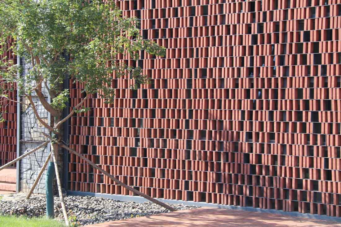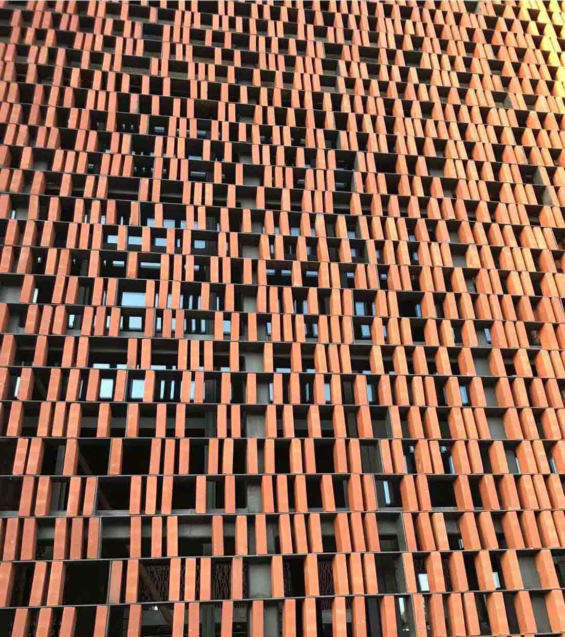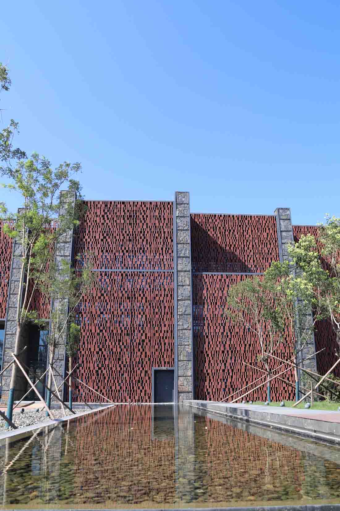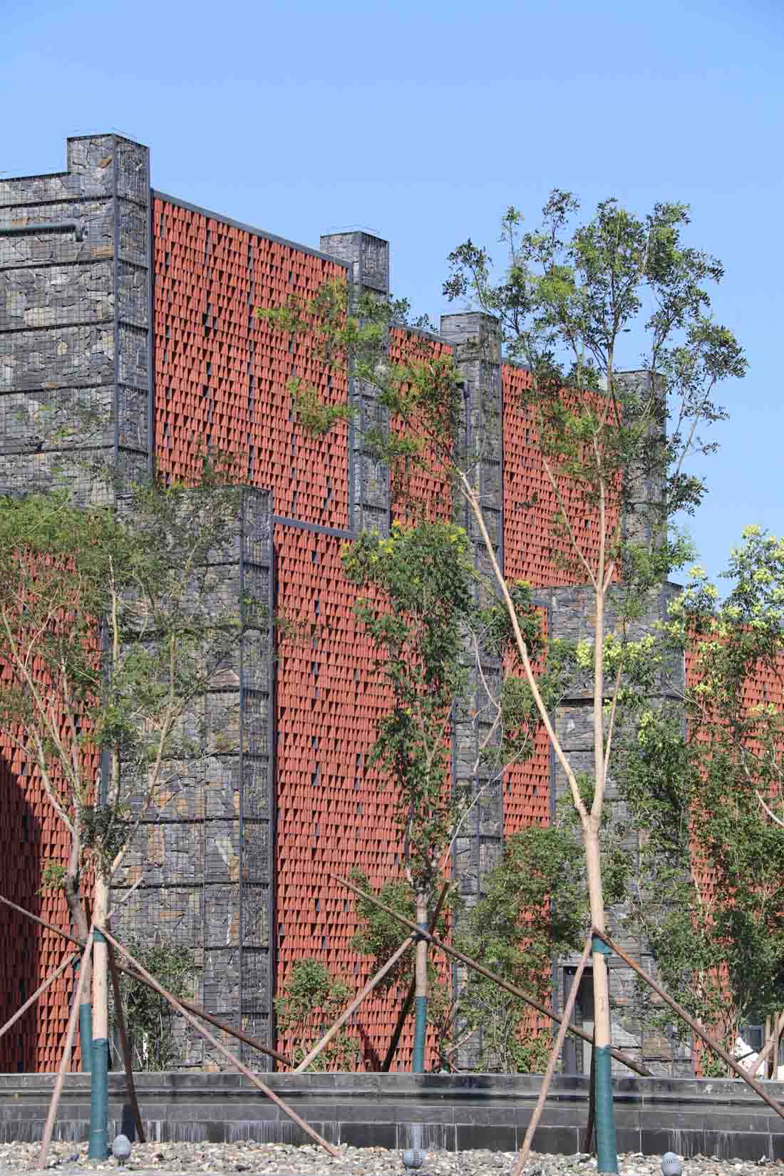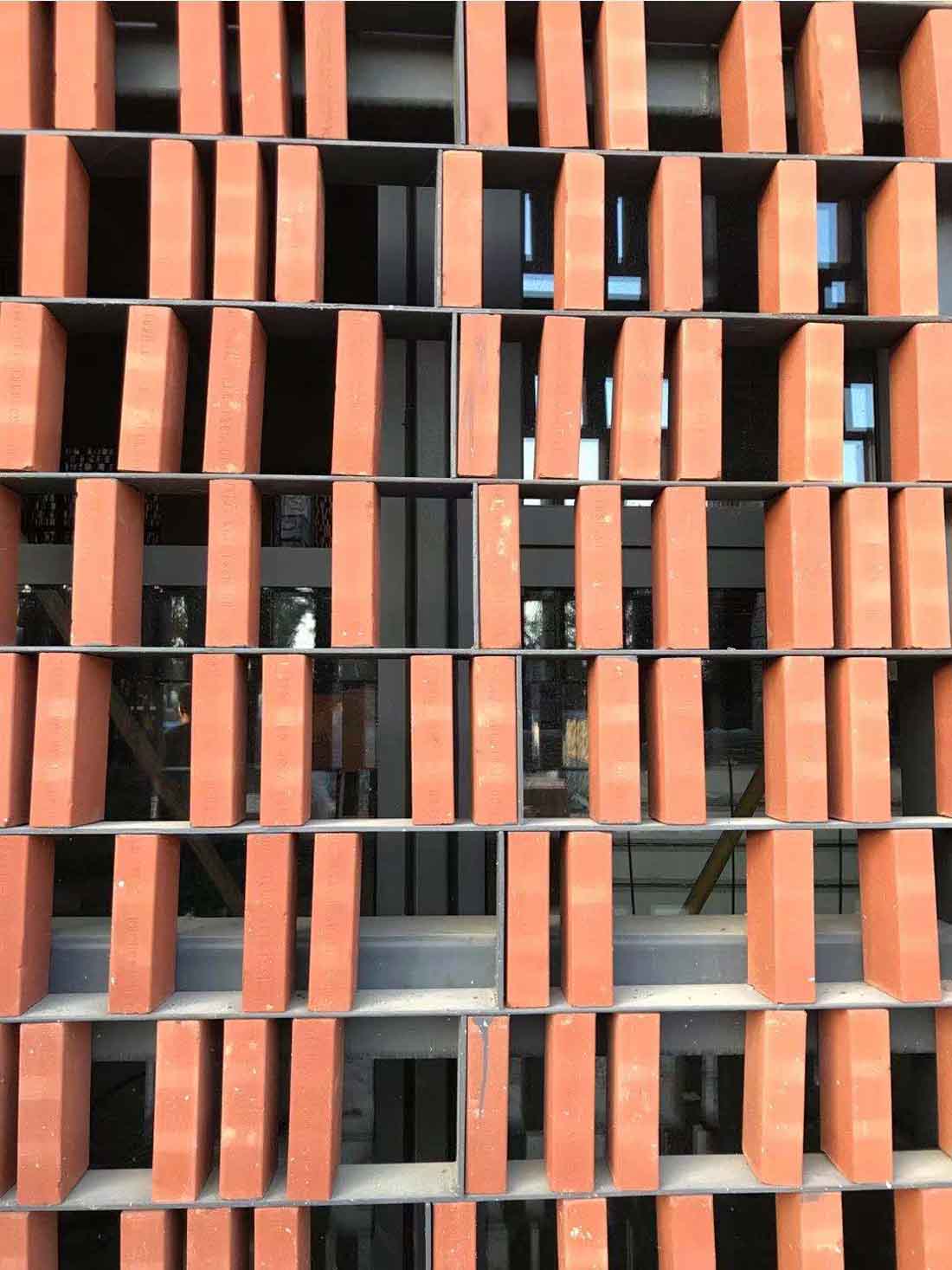 最好的东西,并不是最好的材料。而是在合适地点、合适环境上运用合理。设计一个稳定骨架系统,再往里面塞进竖向排列的红砖,红砖的大小一致,体块均等,看似中规中矩,但是通过不规则的排列与融合,给游客带来不一样的视觉感受。
