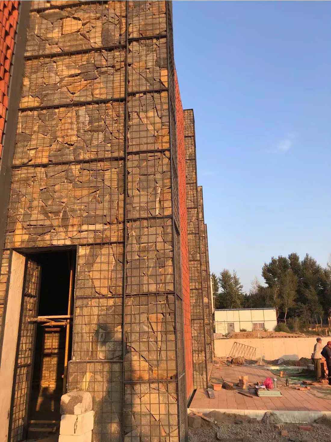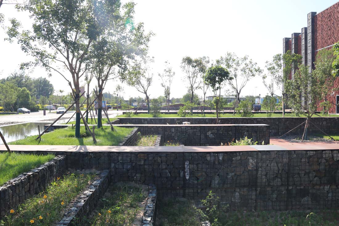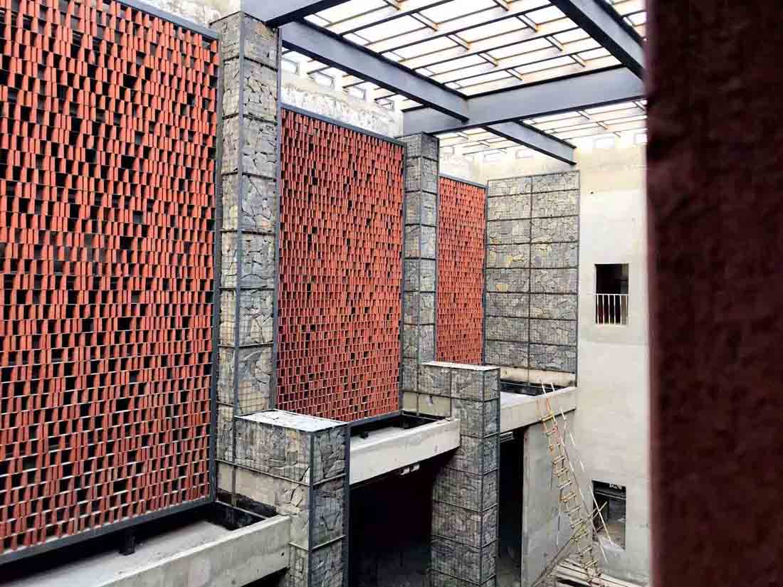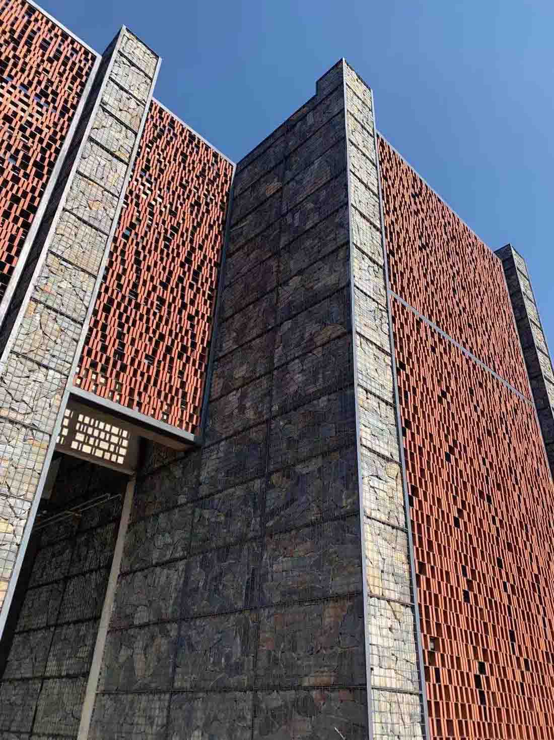 石笼外墙重新定义了建筑的外观,它与红砖结合一起,盘活了整个建筑外观。