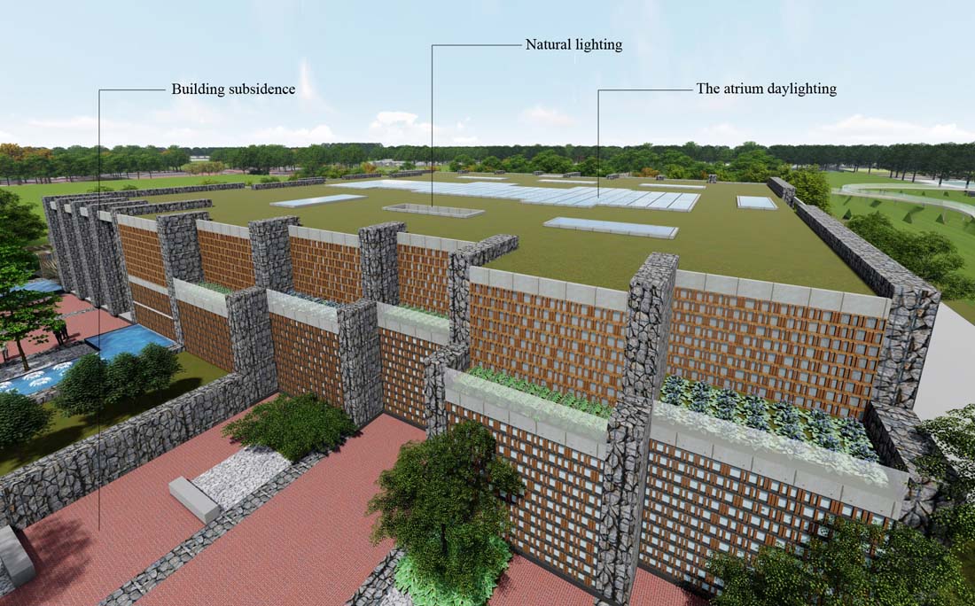 由于农展厅的特殊的位置,当时WAQI就希望做一个在田里面的和自然融合的建筑。庭院下沉,将自然光引入地下,带来更加亲切的体验。整个建筑的肌理延续葡萄园景观肌理,使建筑与环境融合。