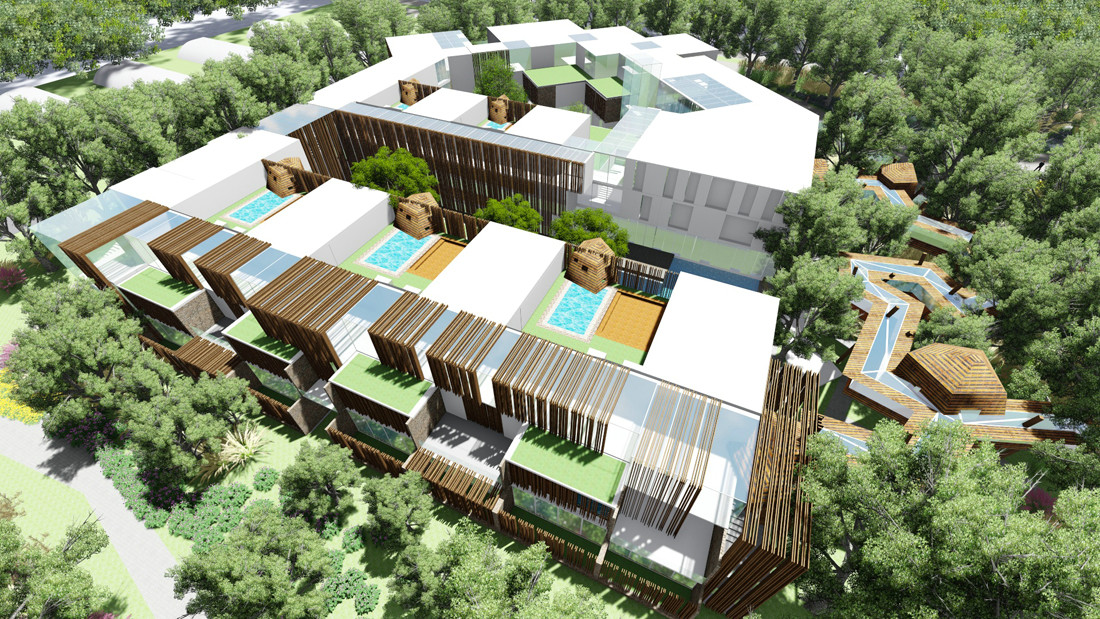 建筑被划分为开放、半开放以及私密空间。入口区域的开放空间,被流动的水系环绕。中庭半开放的温泉投射出粼粼的水光,为建筑塑造了特有的吸引力。每个户型相对独立,体现酒店的精致与私密。整个设计不论在实体或心理层面上都可以说是静待旅客逐步揭开的旅程:每间客房都拥有独立的入户空间,将室外景观引入室内。幽静的林中小路与空中栈道将人引到花园式的室外景观空间。