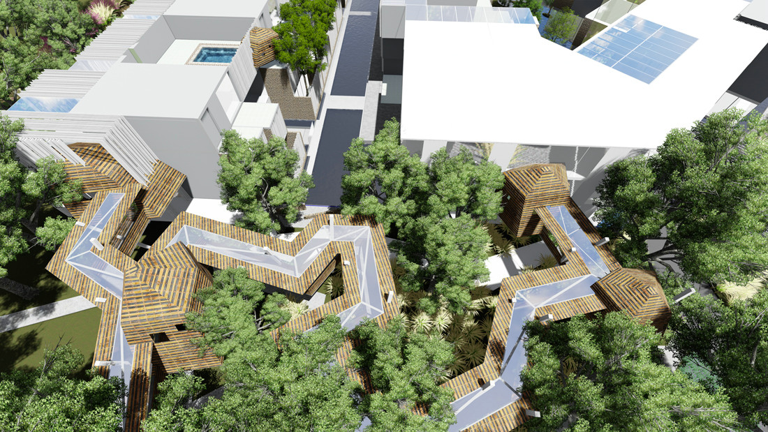 栈道与木屋从现状树林中生长出来,它将是通往花园的重要组成部分,与周边环境融为一体,将现状树得以运用,体现自然的气息,并将平台离开建筑一段距离,为进入建筑的私人花园留出空间,成为独具特色的空中走廊。