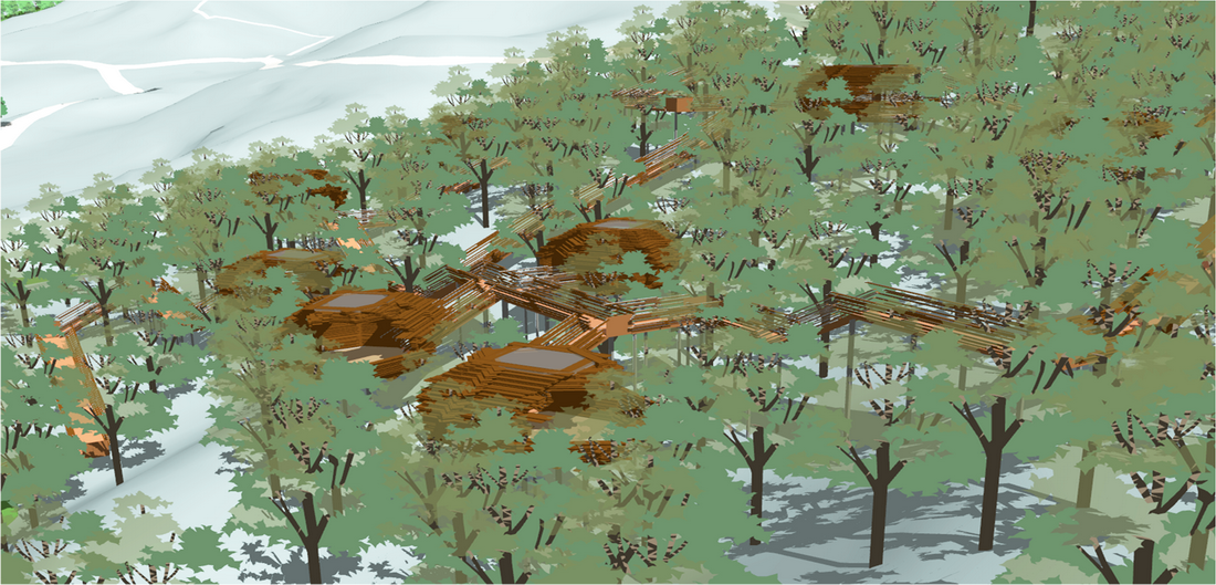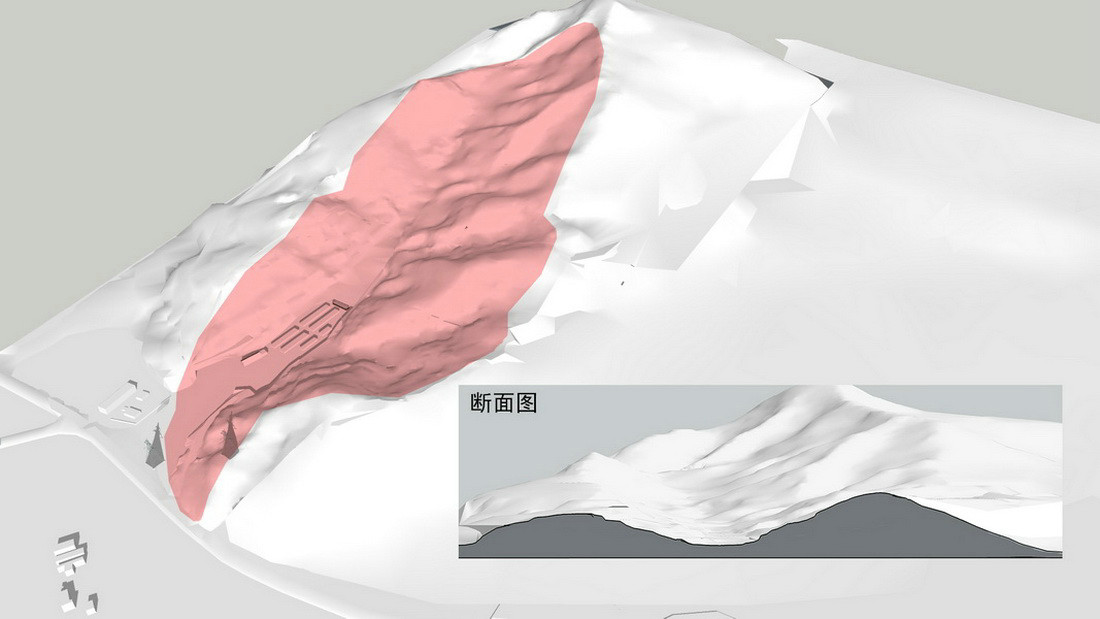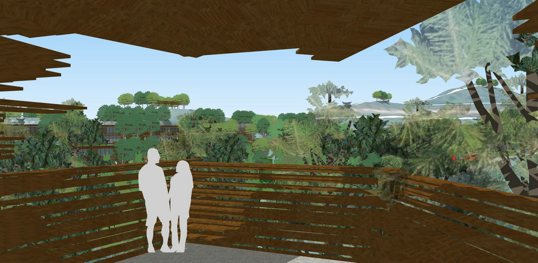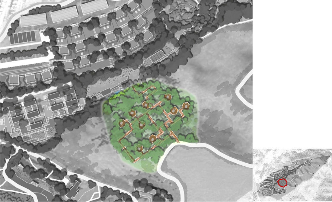 北侧山谷中有一大一小两片以油松为主的生长浓密的植物群落,较大的区域,我们作为山体树屋的建设位置,山体宾馆南北相对。我们希望山体宾馆方向看到北侧的山坡上是更多的树,而不是建筑。希望南北两侧的住宿区都能最大程度的饱览风景。