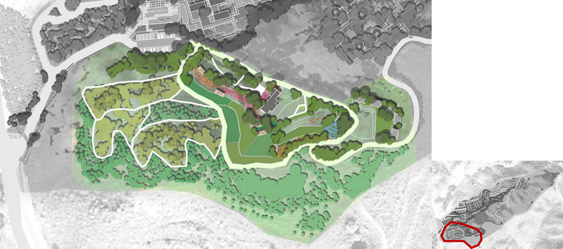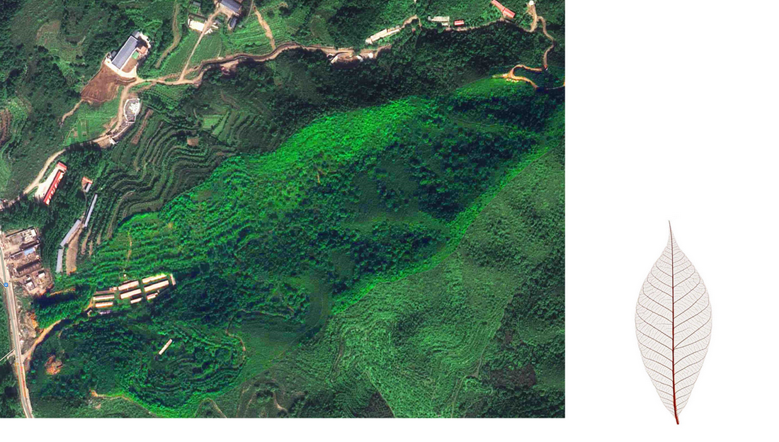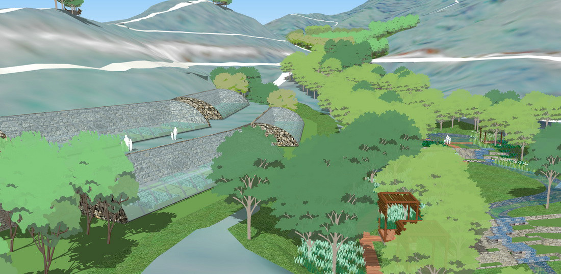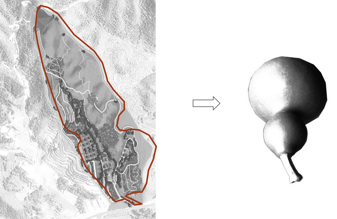 俯视看场地的纹理似一片叶子,主脉,次脉,细胞单元,从中间向周边生长,渗透到每个区域中,而人是场地进行能量交换的载体,在网络中穿梭,构成一个系统的,有机的,可参与的自然空间;并且场地像葫芦一样对外只有一个连接点,且入口区有天然的绿色屏风,整个项目如同隐藏于山谷中,天然有着桃花源式的隐蔽与安宁,满足度假人群亲近自然,隐逸,小逃离的心态,是整个项目好的立足点。