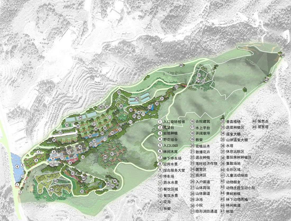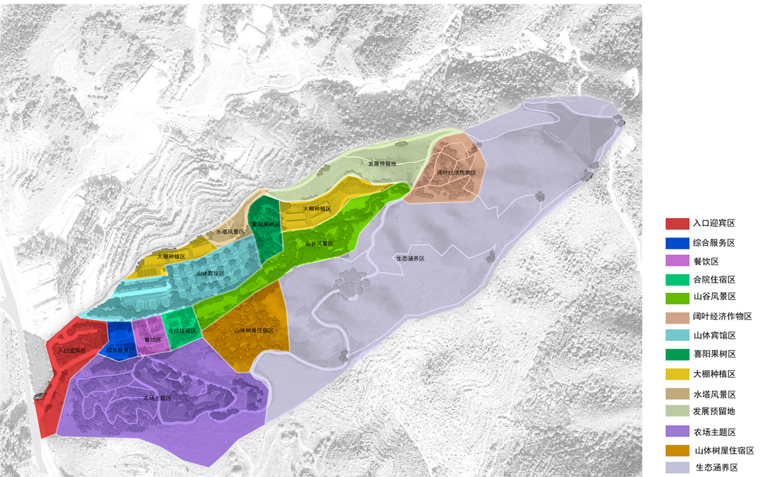 根据功能的不同,设计场地划分为以下几个区域:入口迎宾区,综合服务区,餐饮区,合院住宿区,山谷区,阔叶经济林区,山体宾馆区,认养果树区,大棚种植区,农场主题区,山体树屋住宿区,水塔风景区,发展预留地和生态涵养区。