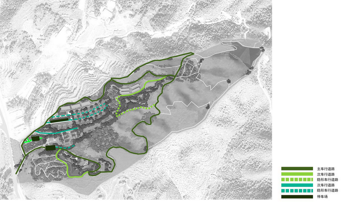 主车行路以现状道路为主,沿设计场地环绕一周。农场区域及山体大棚区域新增两条车行路,满足周边农业生产活动需求。建筑区域设置消防车道,非常用消防车道设计为隐形消防,最大程度减少裸露硬质景观的面积。人行路以山谷漫步道为中心向两侧蔓延至各个区域