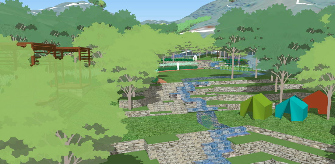 山谷区在餐饮与住宿后方,是整个项目的“后花园”。我们将台地与台阶,退台,种植,相结合,解决因高差产生的交通的阻碍,同时自然的台地营造一种野趣。我们也局部引入了“水元素”,山水相依的感觉,水体随着地形变化,有跌水,瀑布,镜水面三种形式