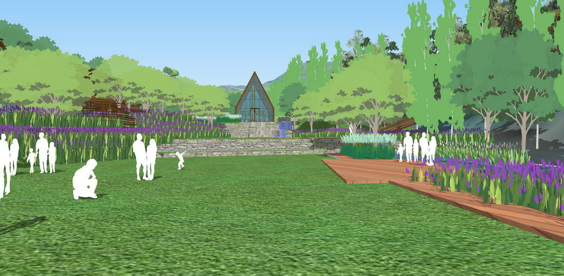 谷地区域大部分以自然景观为主,形成或大或小的活动空间可以作为活动场所,供游客休息,玩耍;谷地中央狭窄处有小型教堂,打破冗长的谷地景观,成为花海中的玻璃房,也是谷地区域视觉中心,同时也提供了举办活动提供了可能,比如婚礼,比如PARTY,年会,大型花艺课程等等